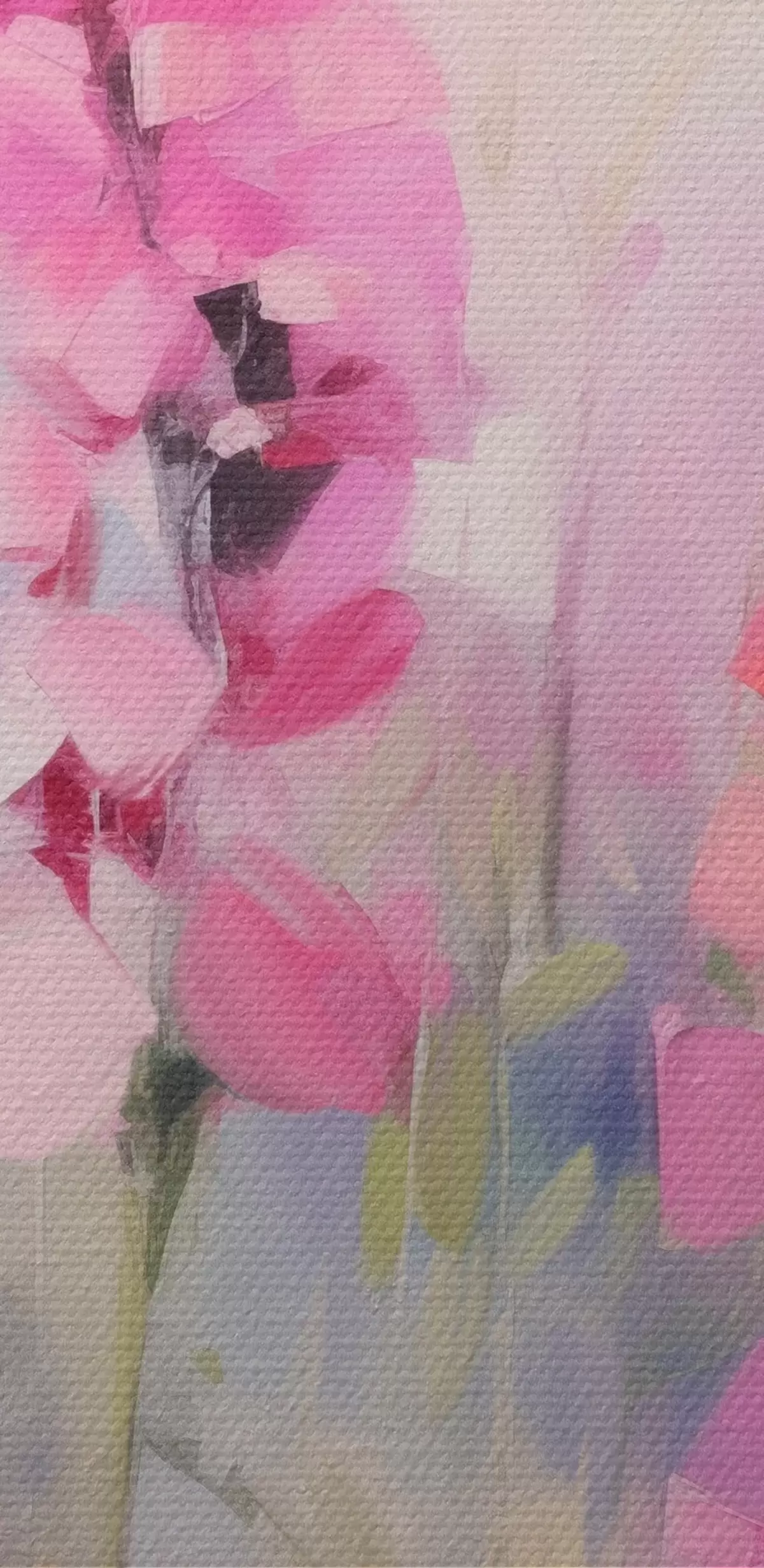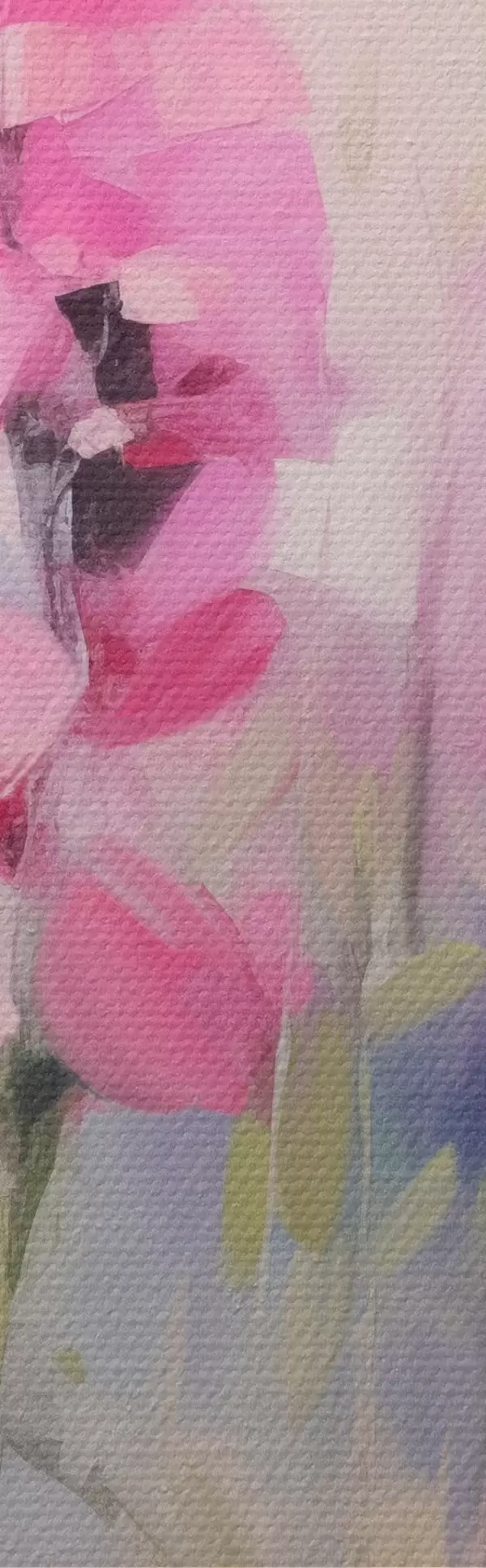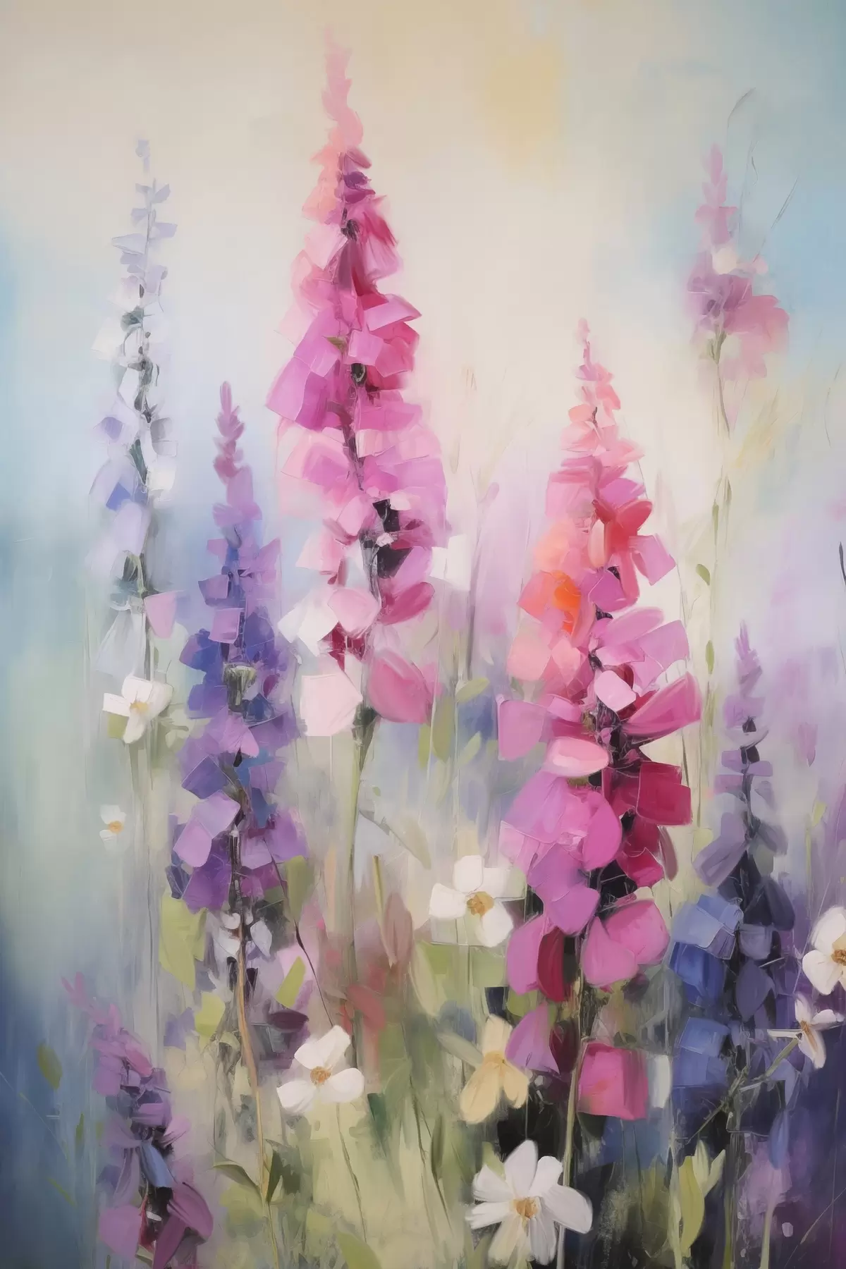 murales Flores rosas y moradas con margaritas blancas en un campo, pinceladas suaves, colores pastel, estilo impresionista s46279