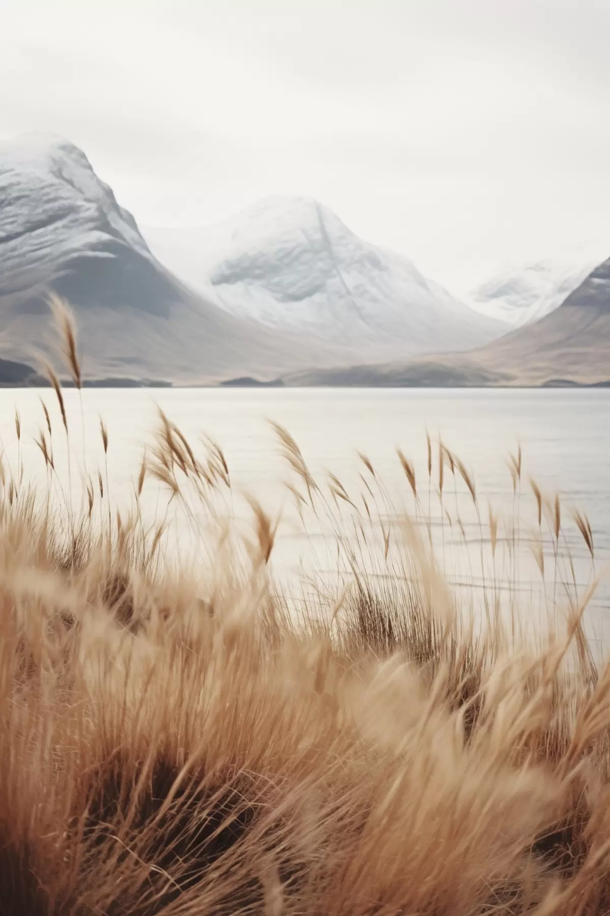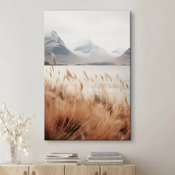 murales Campo de hierba de la pampa frente a un paisaje lacustre con montañas nevadas al fondo, luz suave s46282