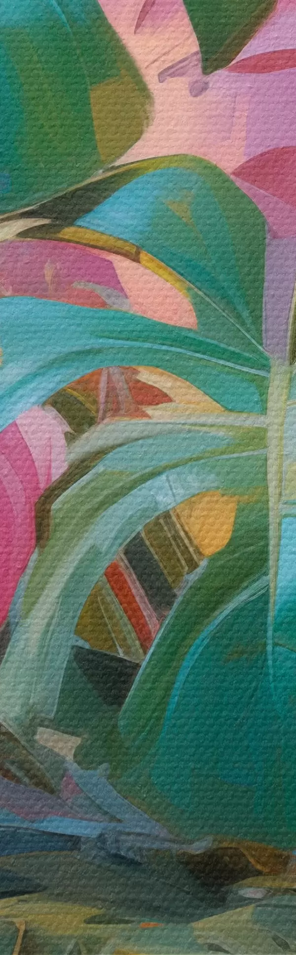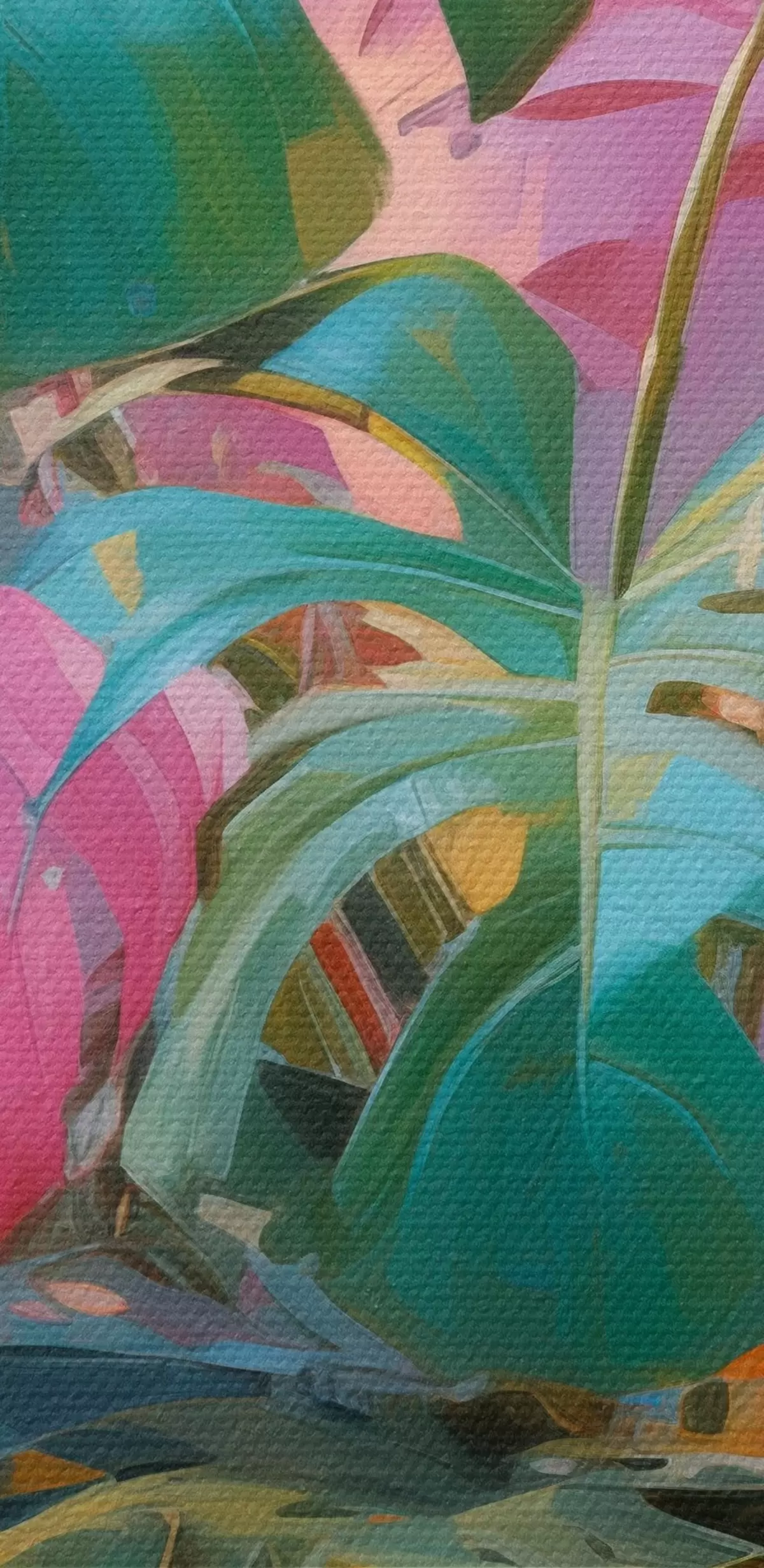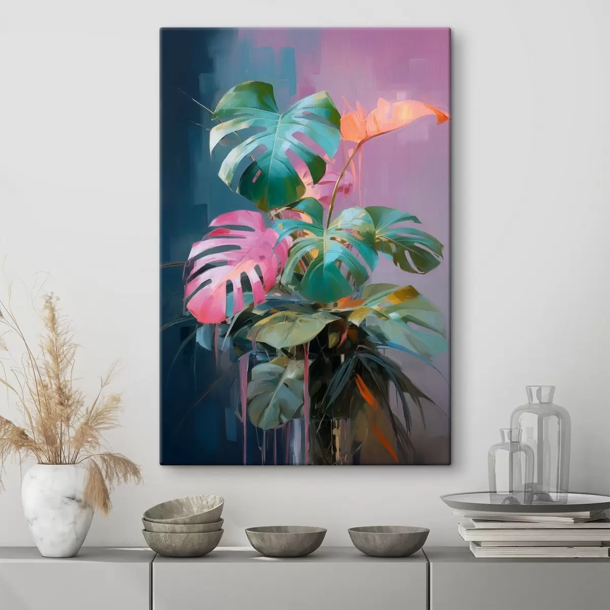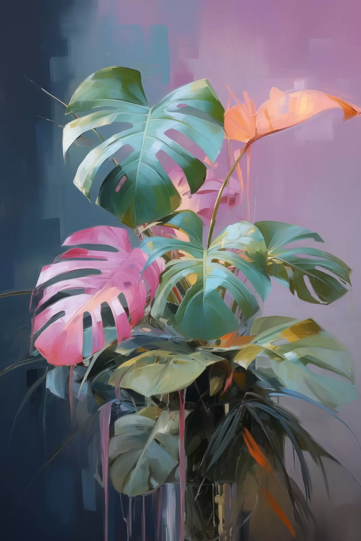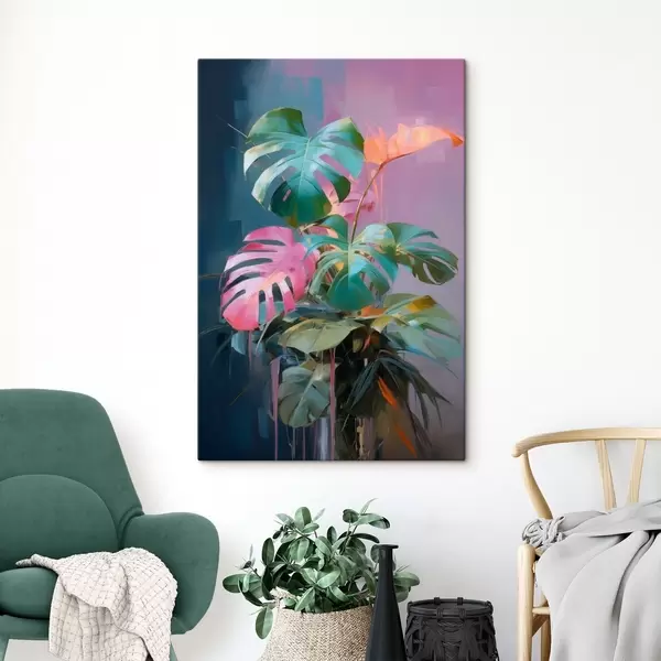 murales Planta monstera abstracta con hojas rosas y verdes, colores vibrantes, sobre un fondo difuminado s46287