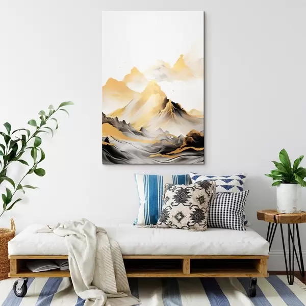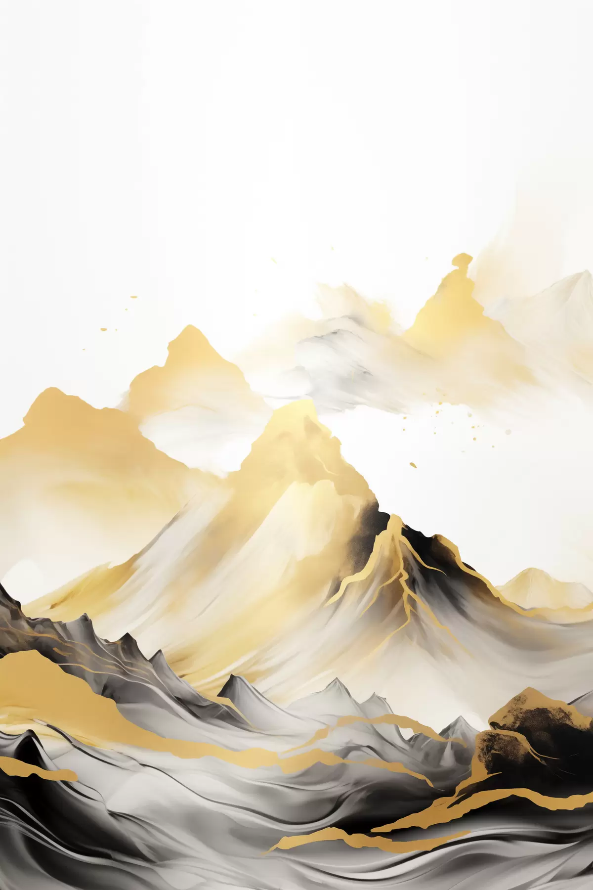 murales Montañas amarillas y negras con picos nevados, estilo de pintura con tinta china, cordillera minimalista s46684