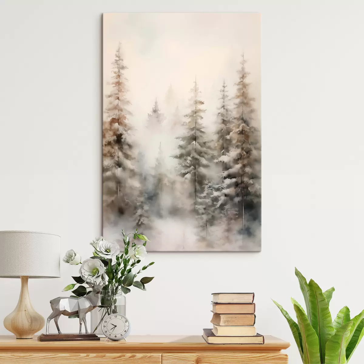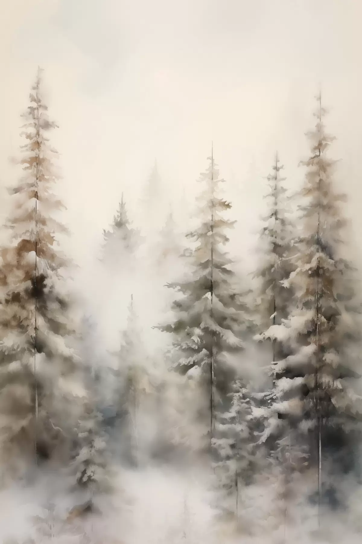 murales Altos pinos cubiertos de nieve, erguidos en un bosque brumoso, una escena invernal suave y apagada s46701