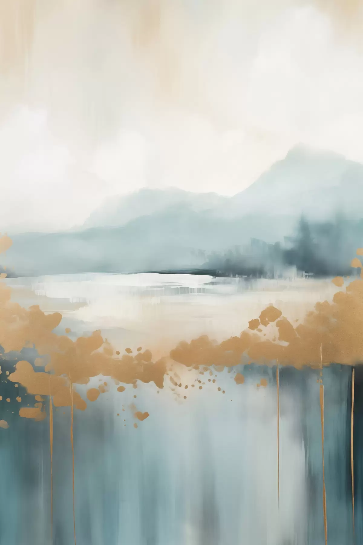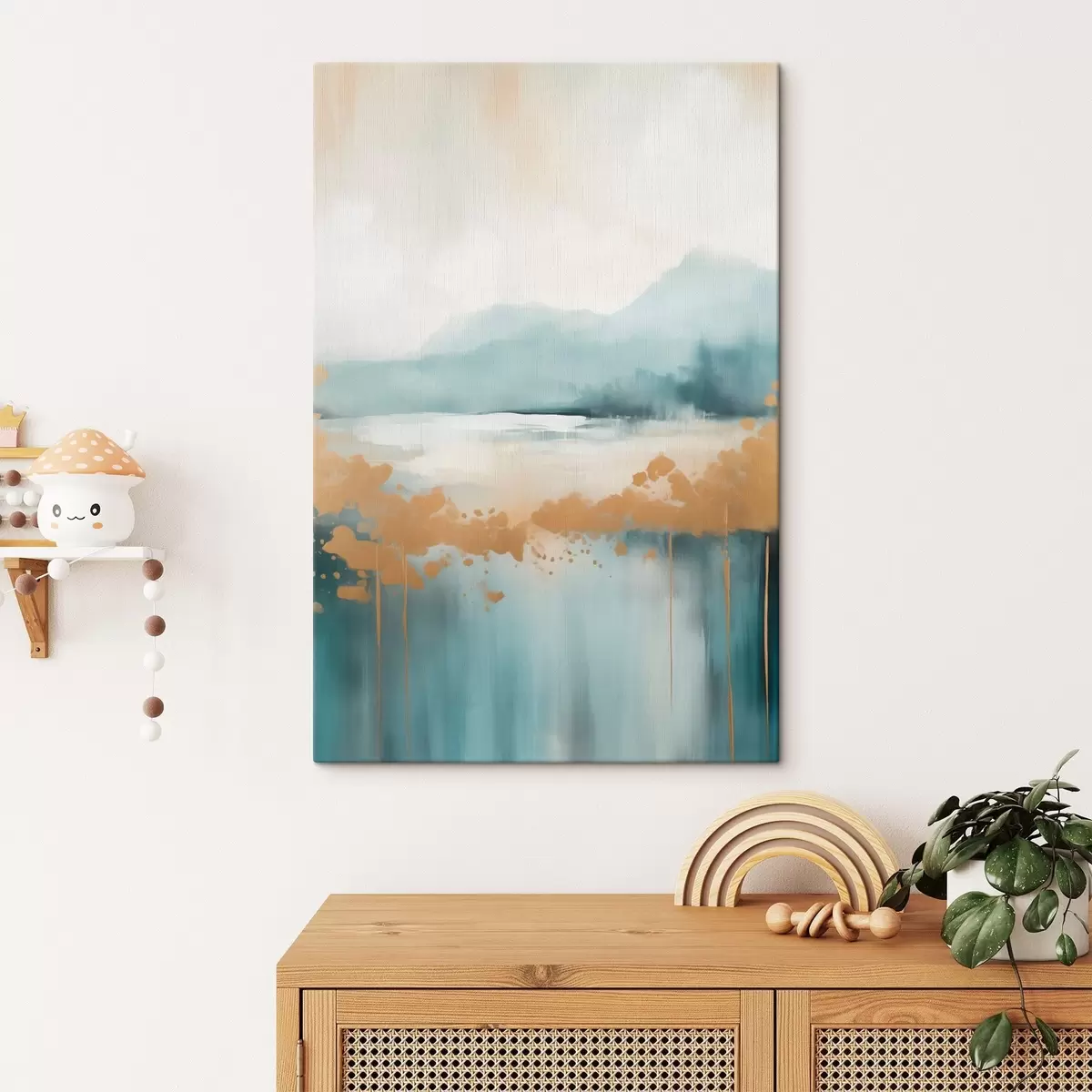 murales Paisaje abstracto con montañas y lago en verde azulado y amarillo texturizado, pinceladas suaves, obra de arte minimalista s46703