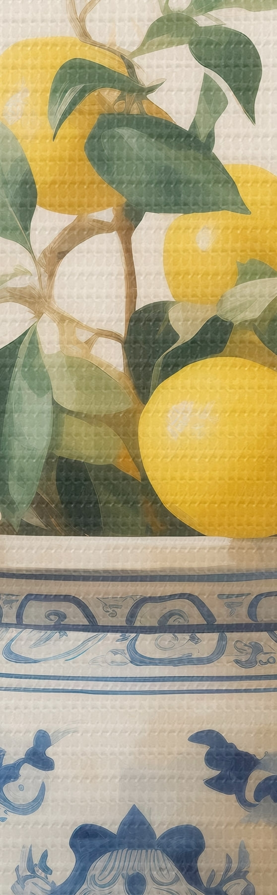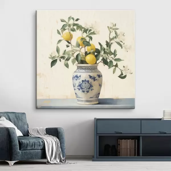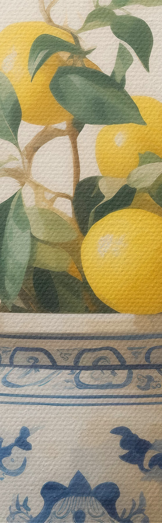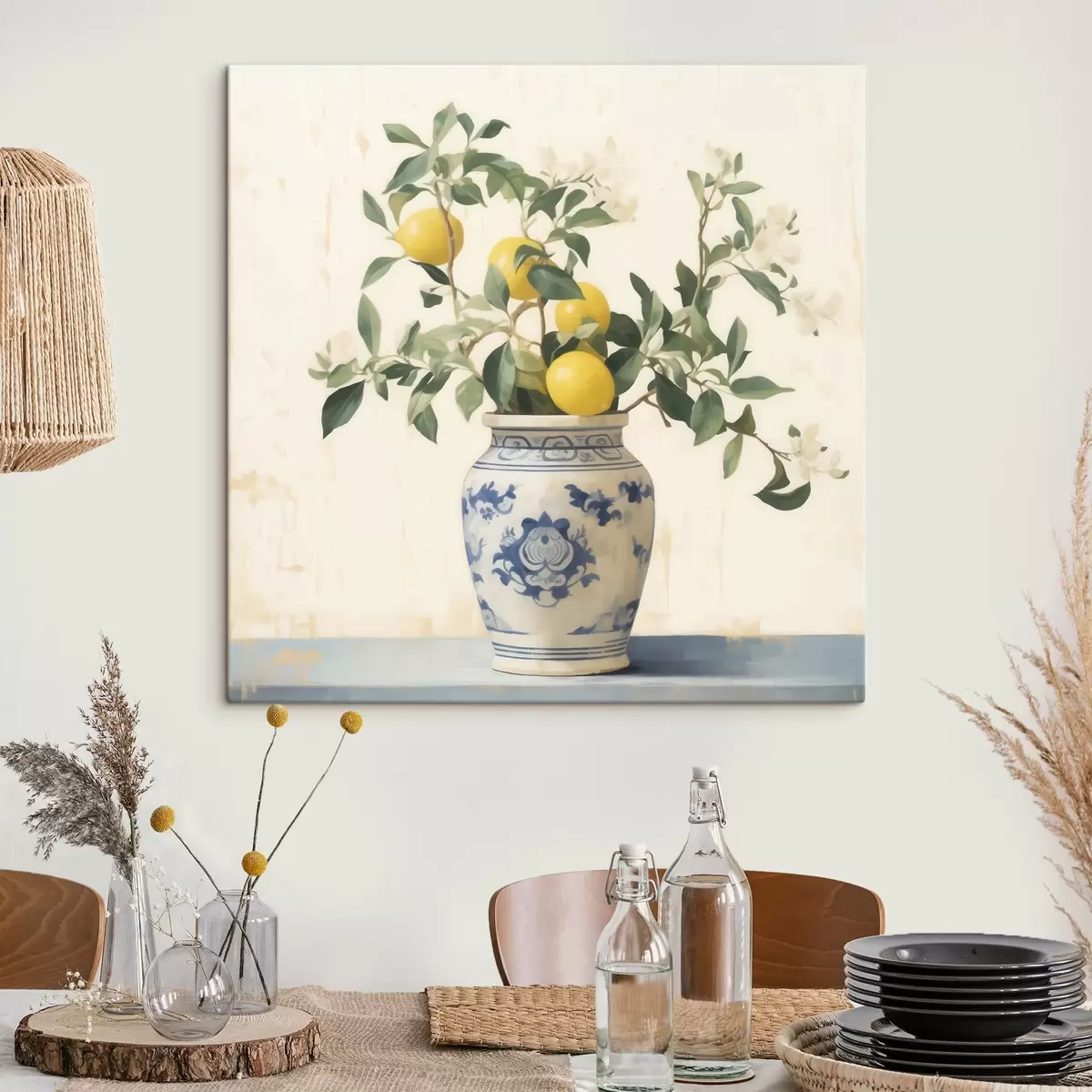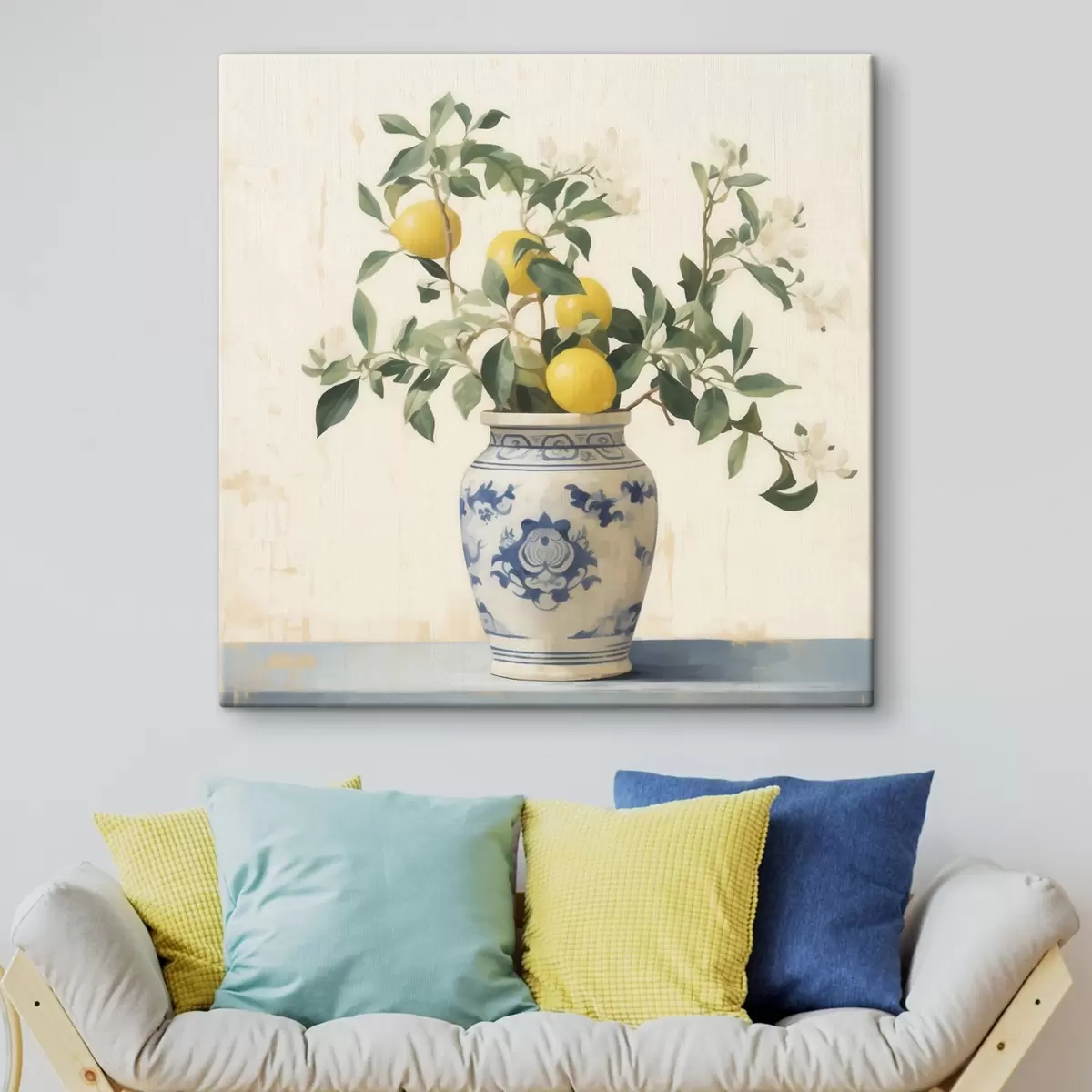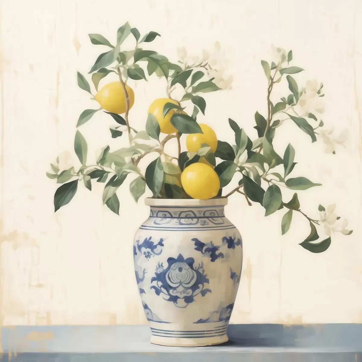 murales Limones en un jarrón de cerámica azul y blanco al estilo de una pintura al óleo. s46924