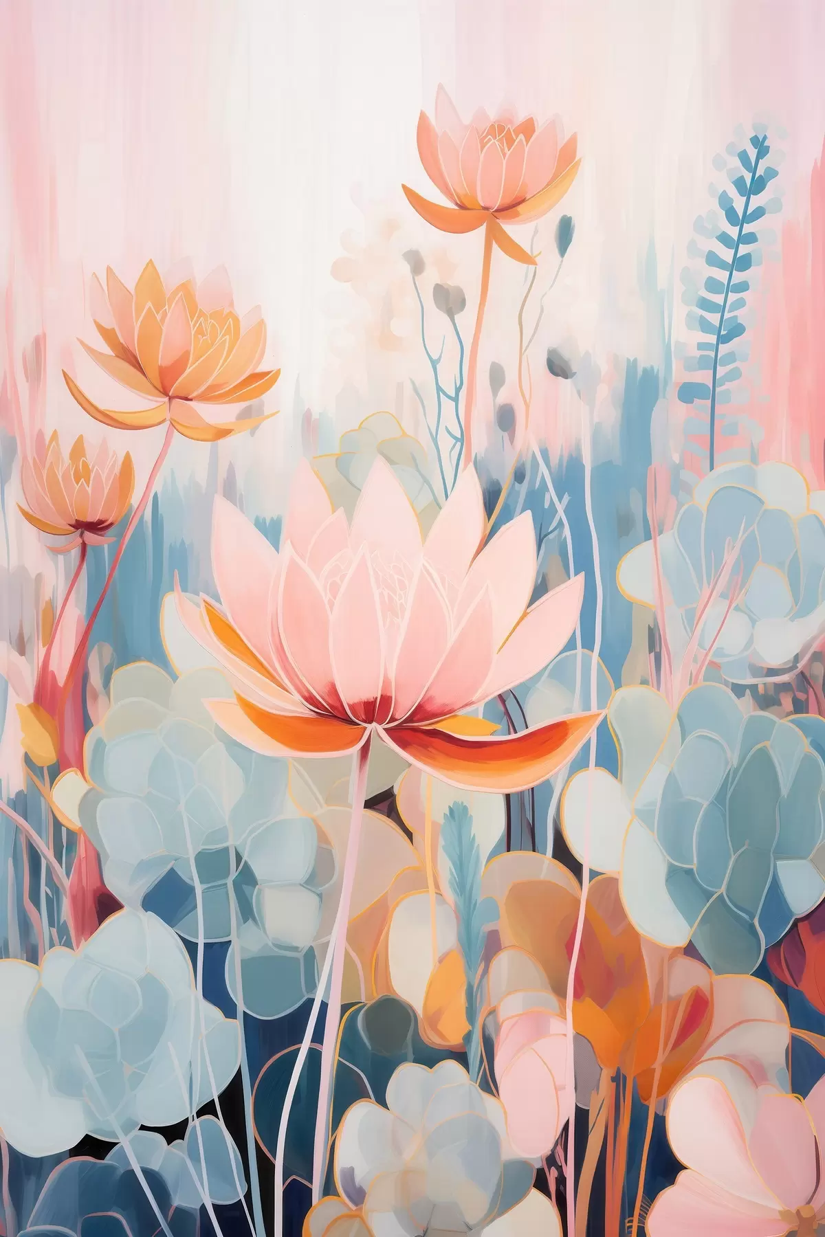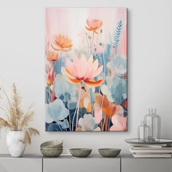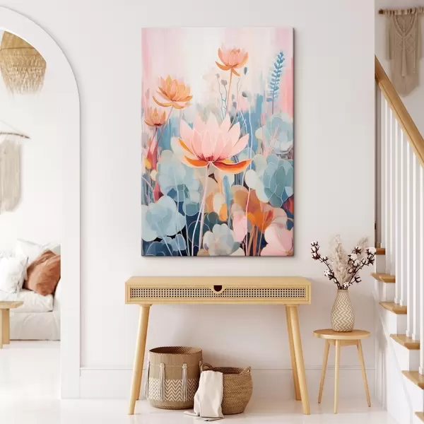 murales Lotos y follaje decorativo en una paleta de colores rosa y azul. s46929