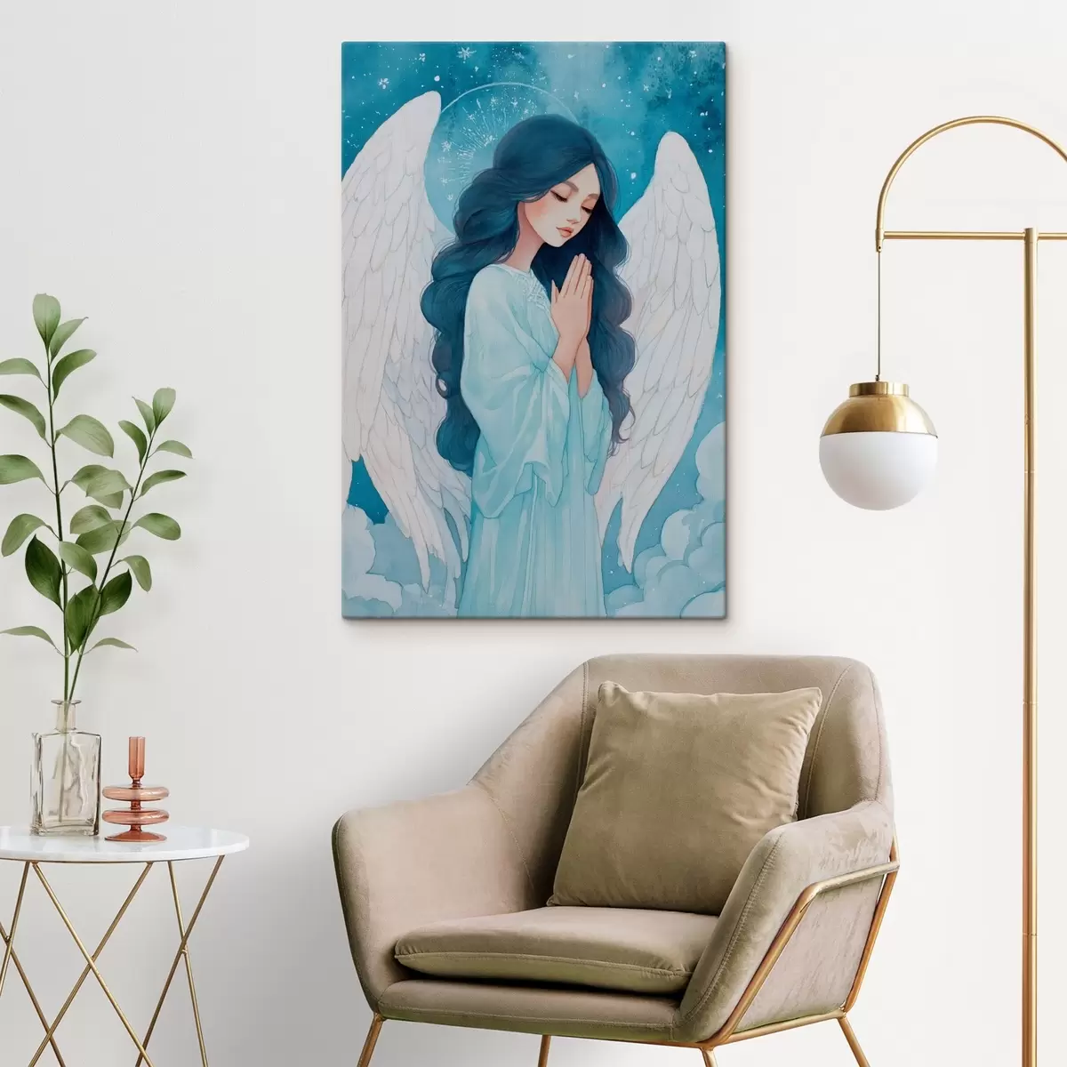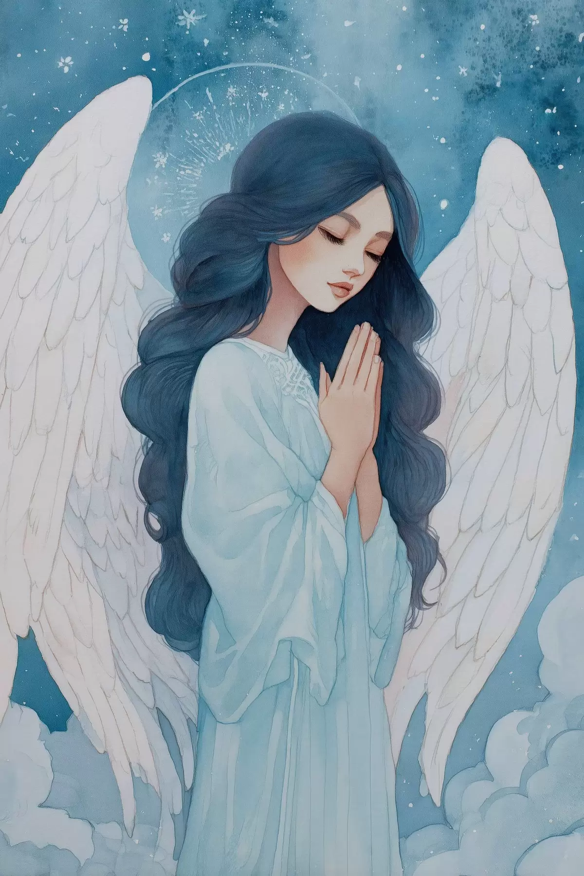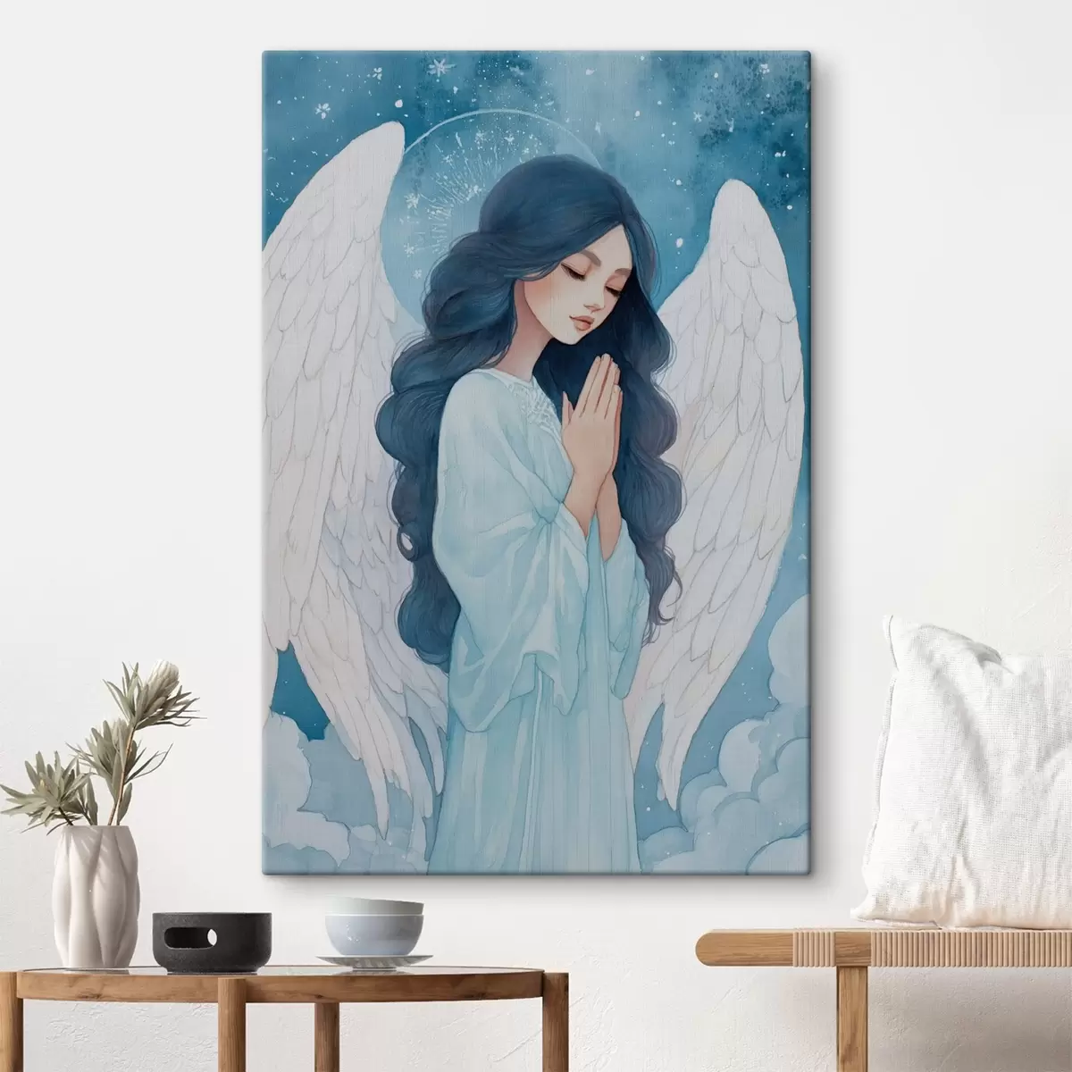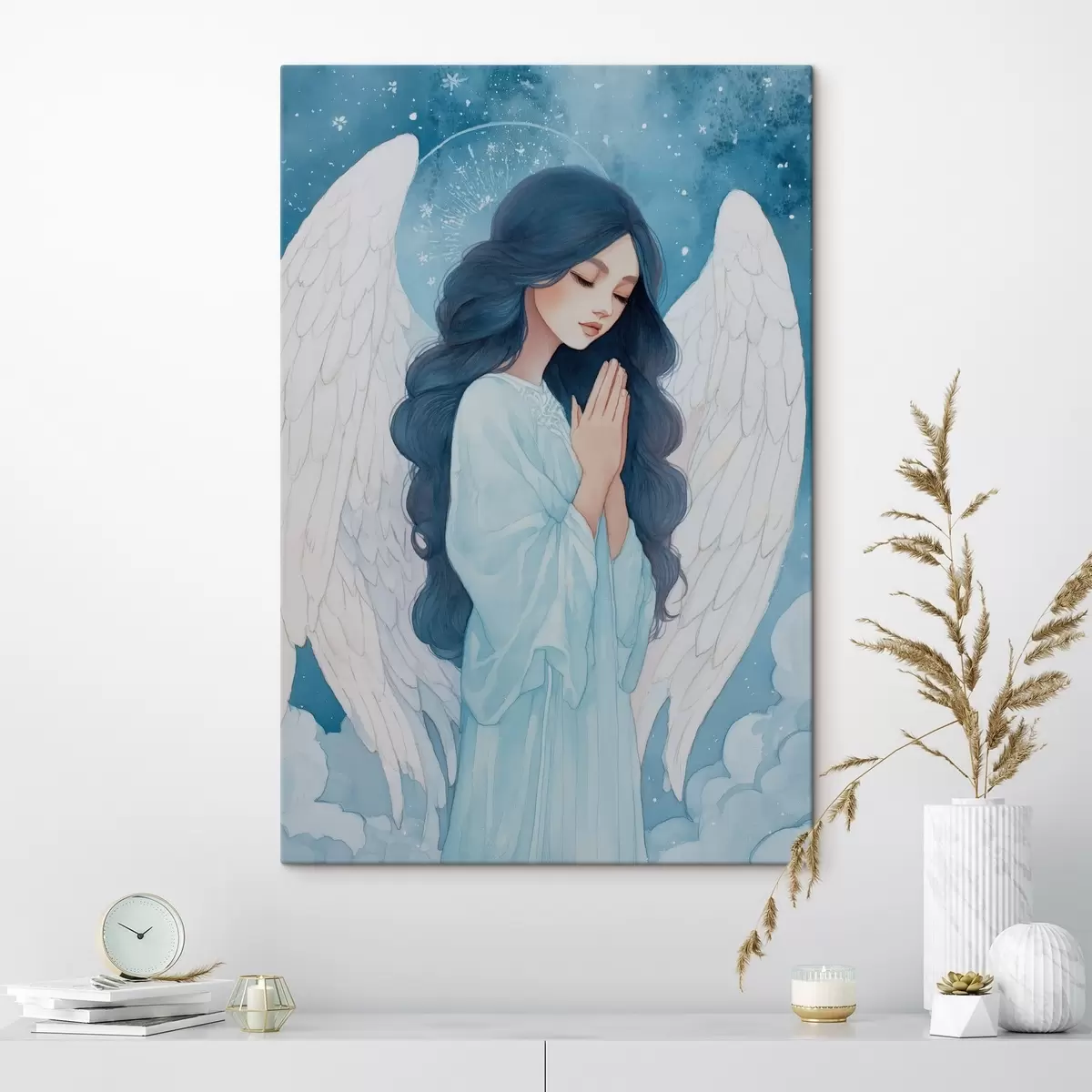 murales Encantadora ilustración de un ángel entre las nubes en una paleta de colores blanco y azul. s47095