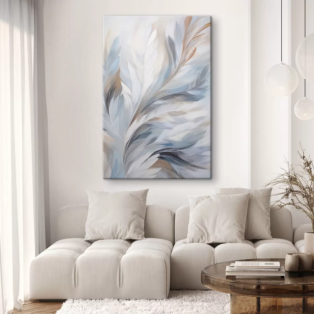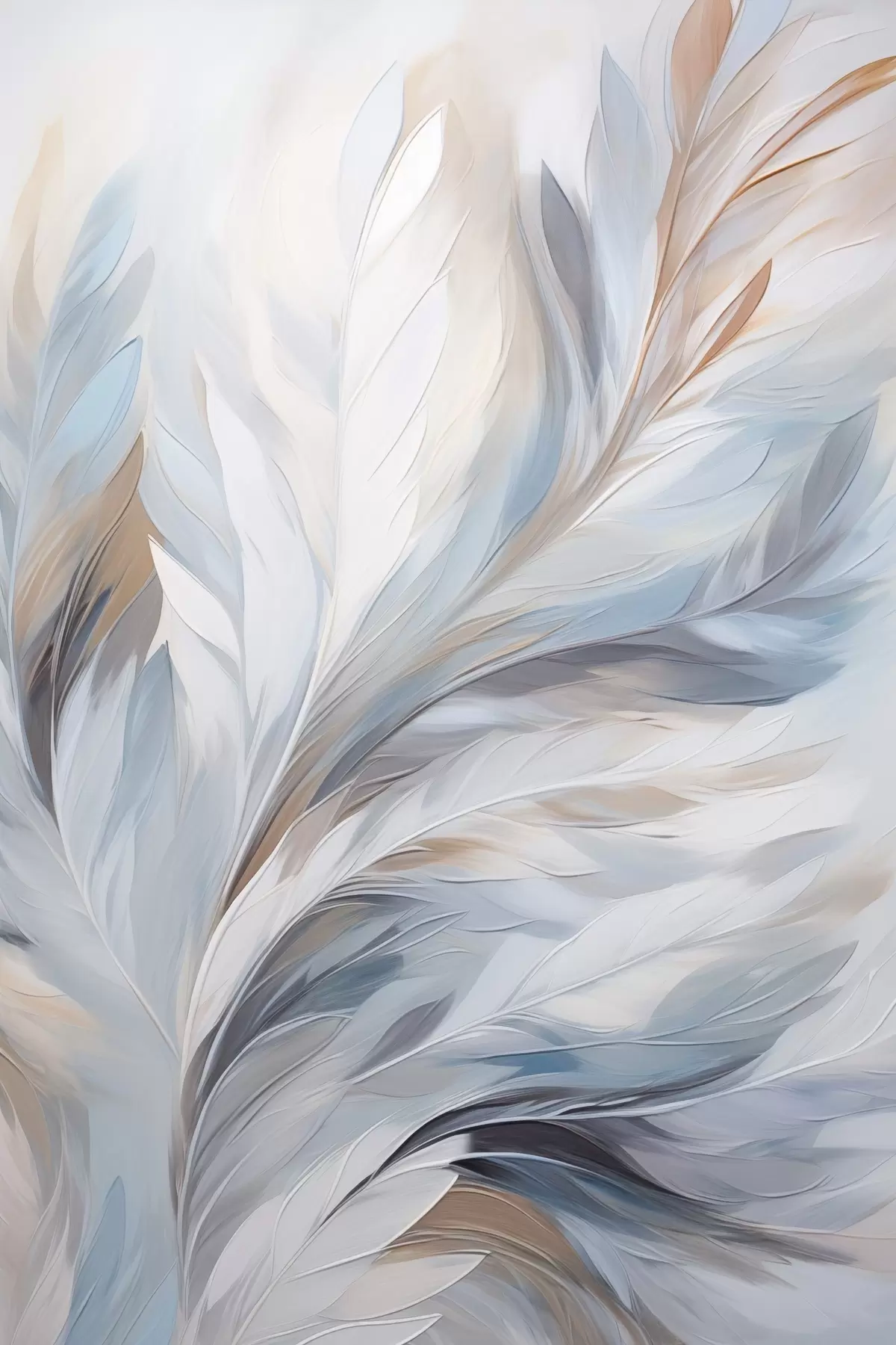 murales Delicadas plumas azul claro y marrón con una textura suave y etérea, sobre un fondo blanco. s47416
