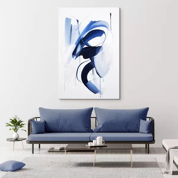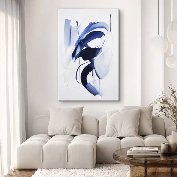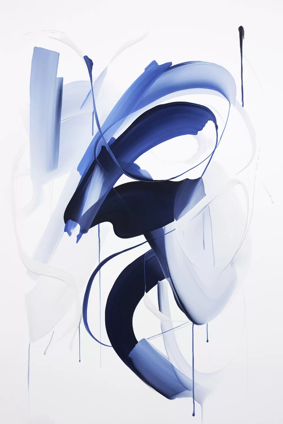 murales Formas abstractas azules similares a pinceladas con líneas y curvas fluidas sobre un fondo blanco, arte moderno. s47428