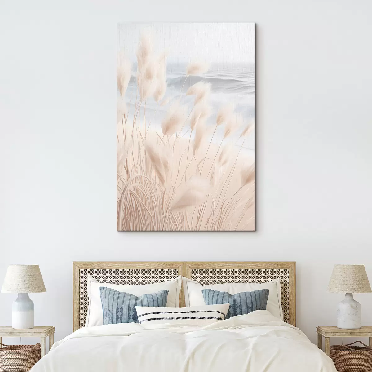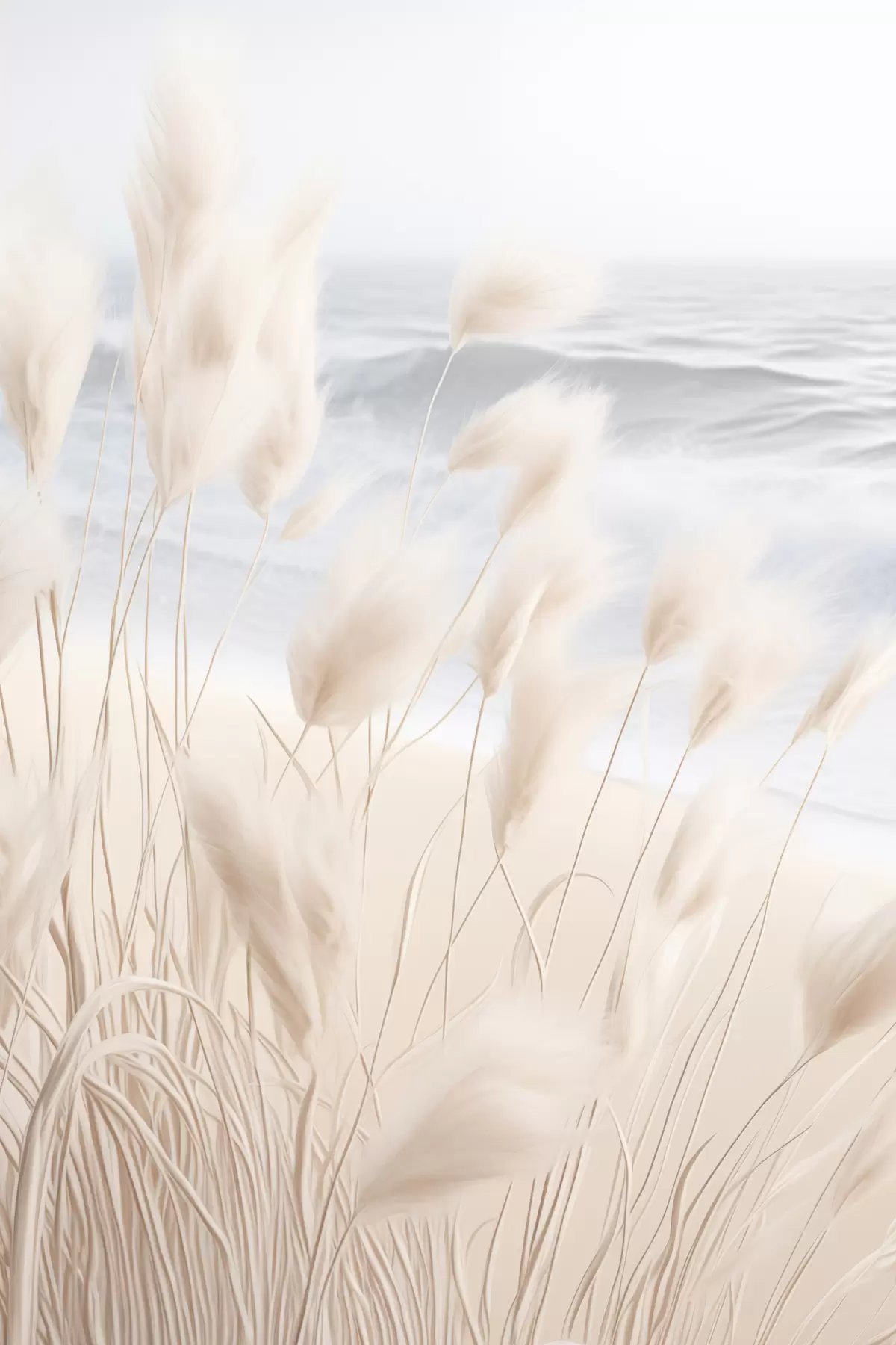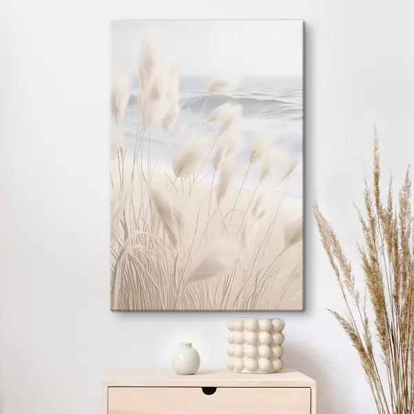murales Hierba alta y plumosa de la pampa en suaves tonos beige en primer plano, con una playa de arena al fondo. s47432