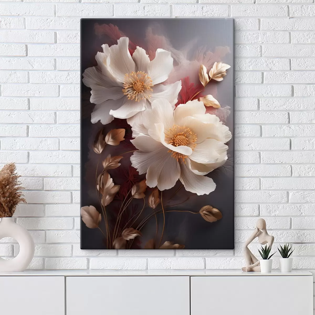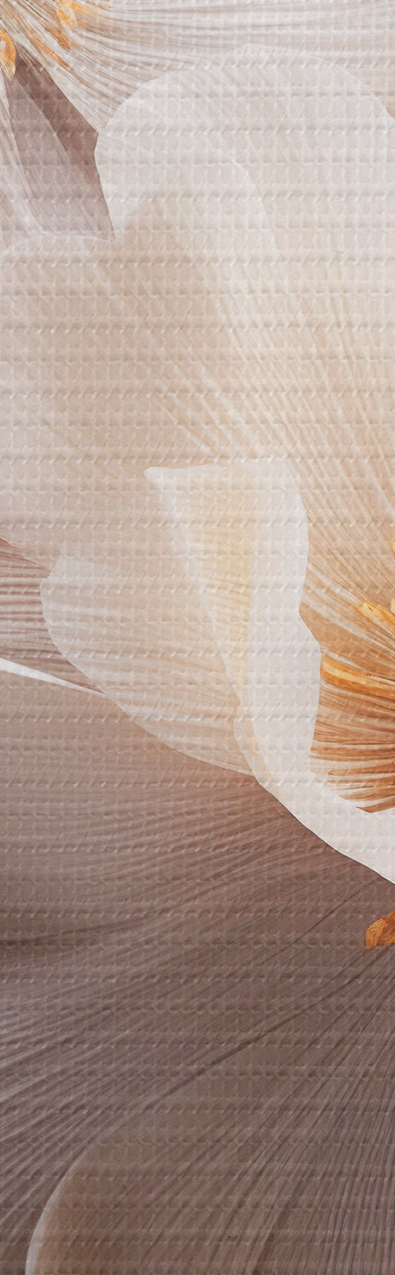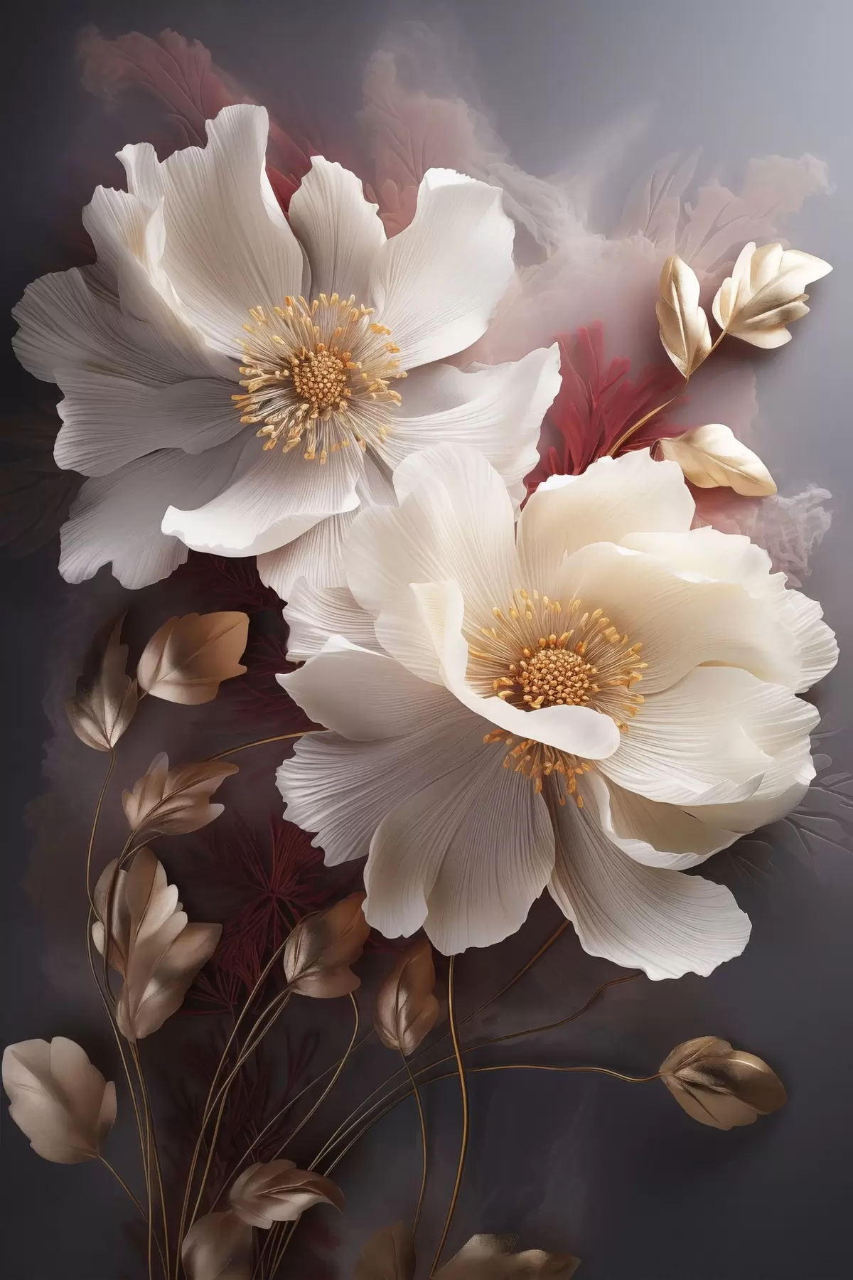 murales Delicadas peonías con pétalos finos y tenues, rodeadas de hojas de color rojo oscuro y amarillo sobre un fondo abstracto. s47435
