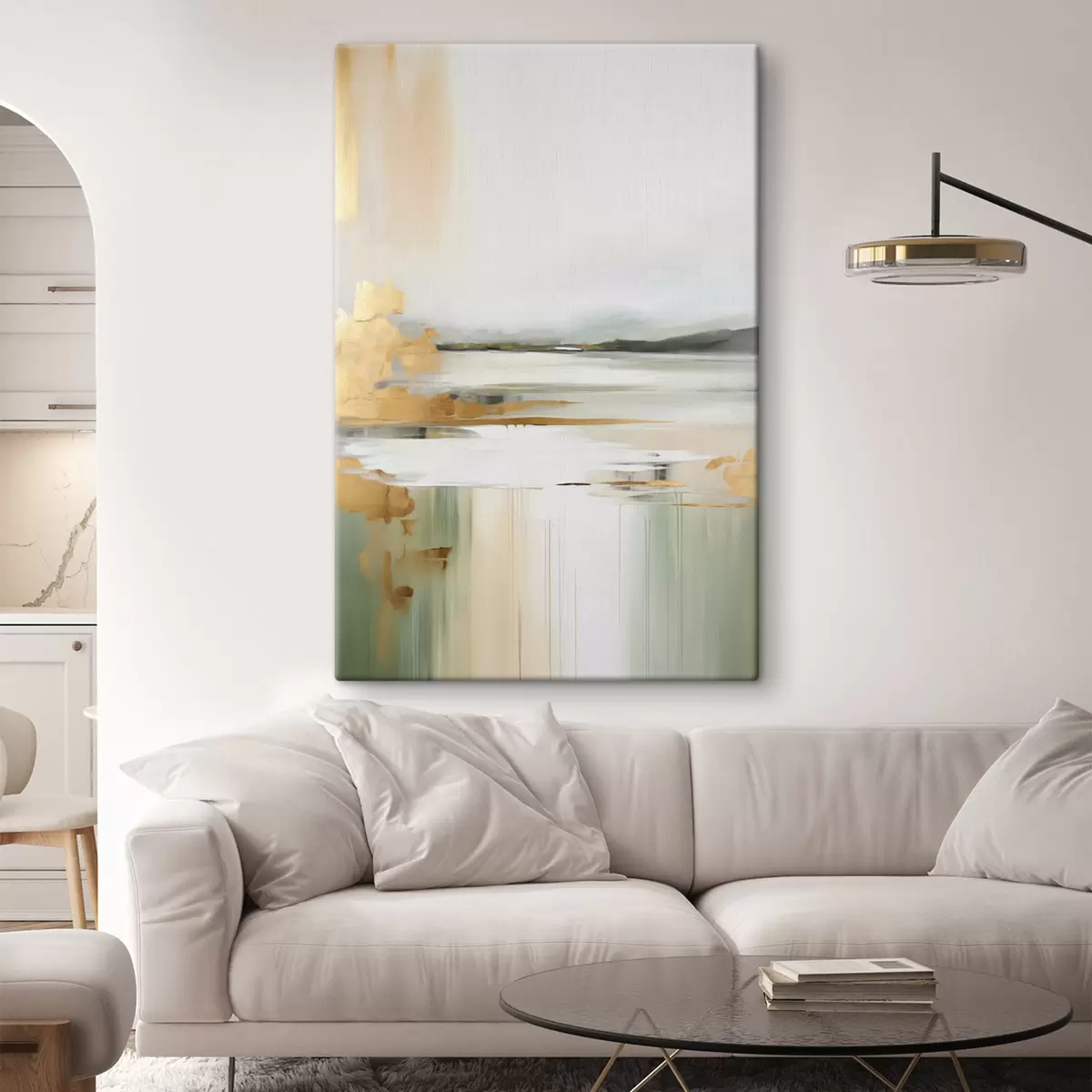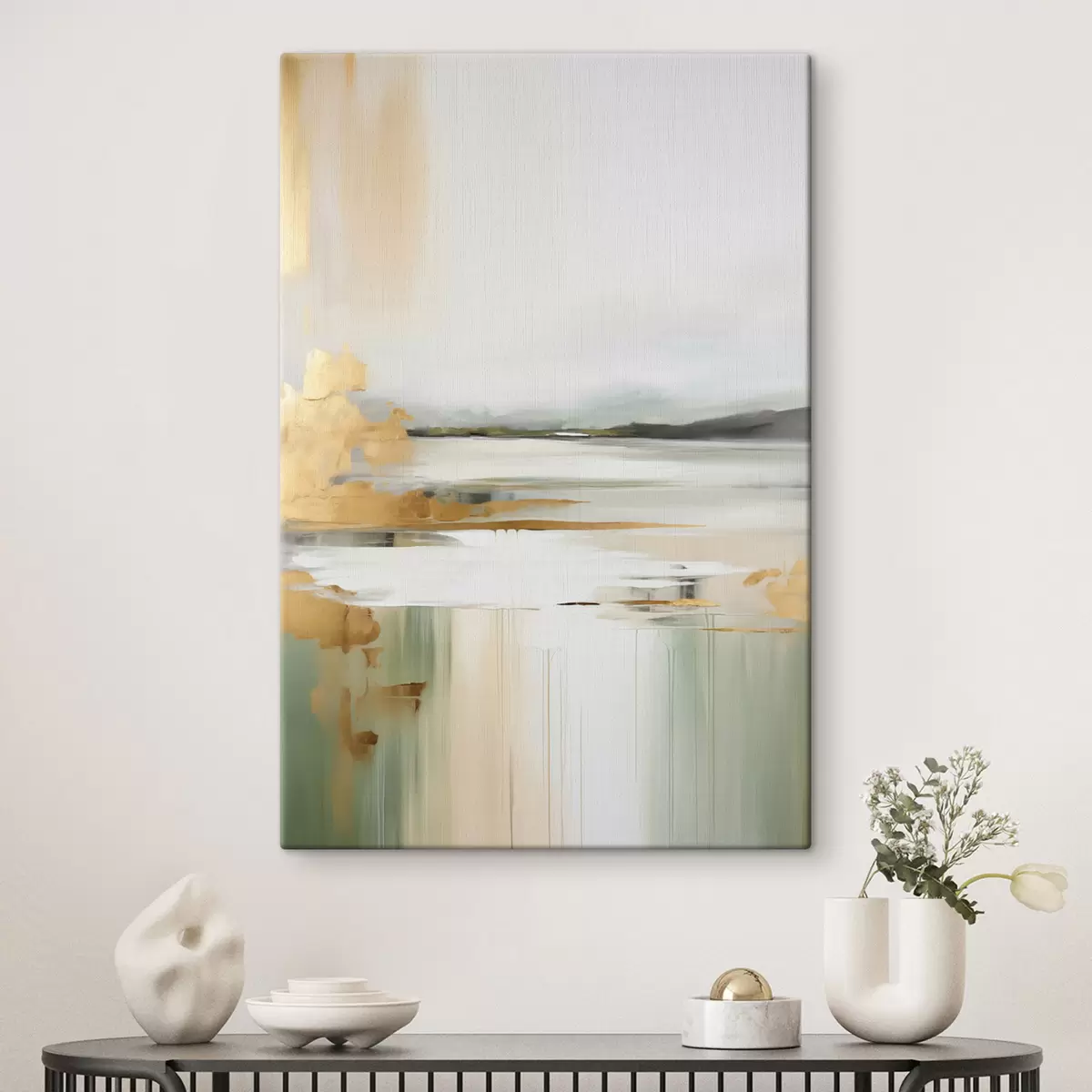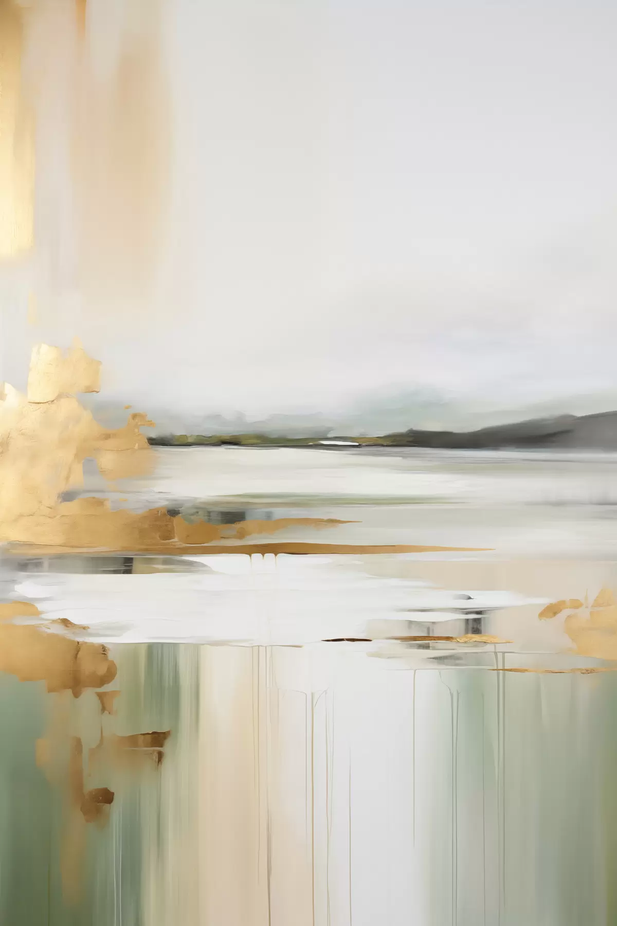 murales Paisaje abstracto con tonos amarillos y verdes, agua que refleja el cielo y montañas lejanas, cielo pálido y brumoso. s47438