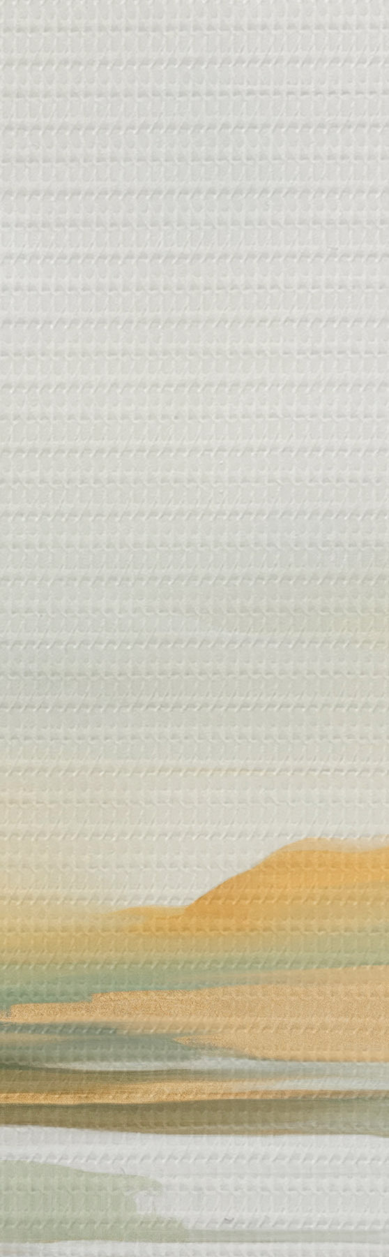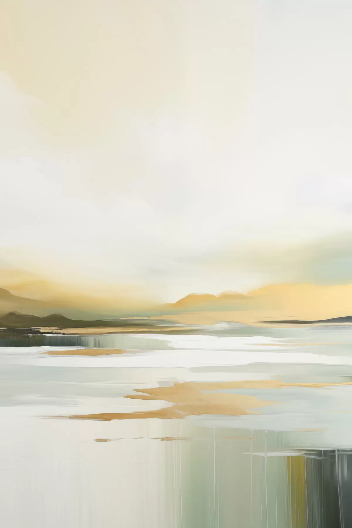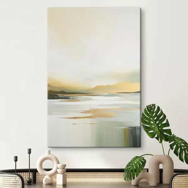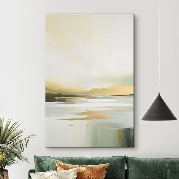 murales Paisaje abstracto con tonos amarillos y verdes, agua que refleja el cielo y montañas lejanas, cielo pálido y brumoso. s47439