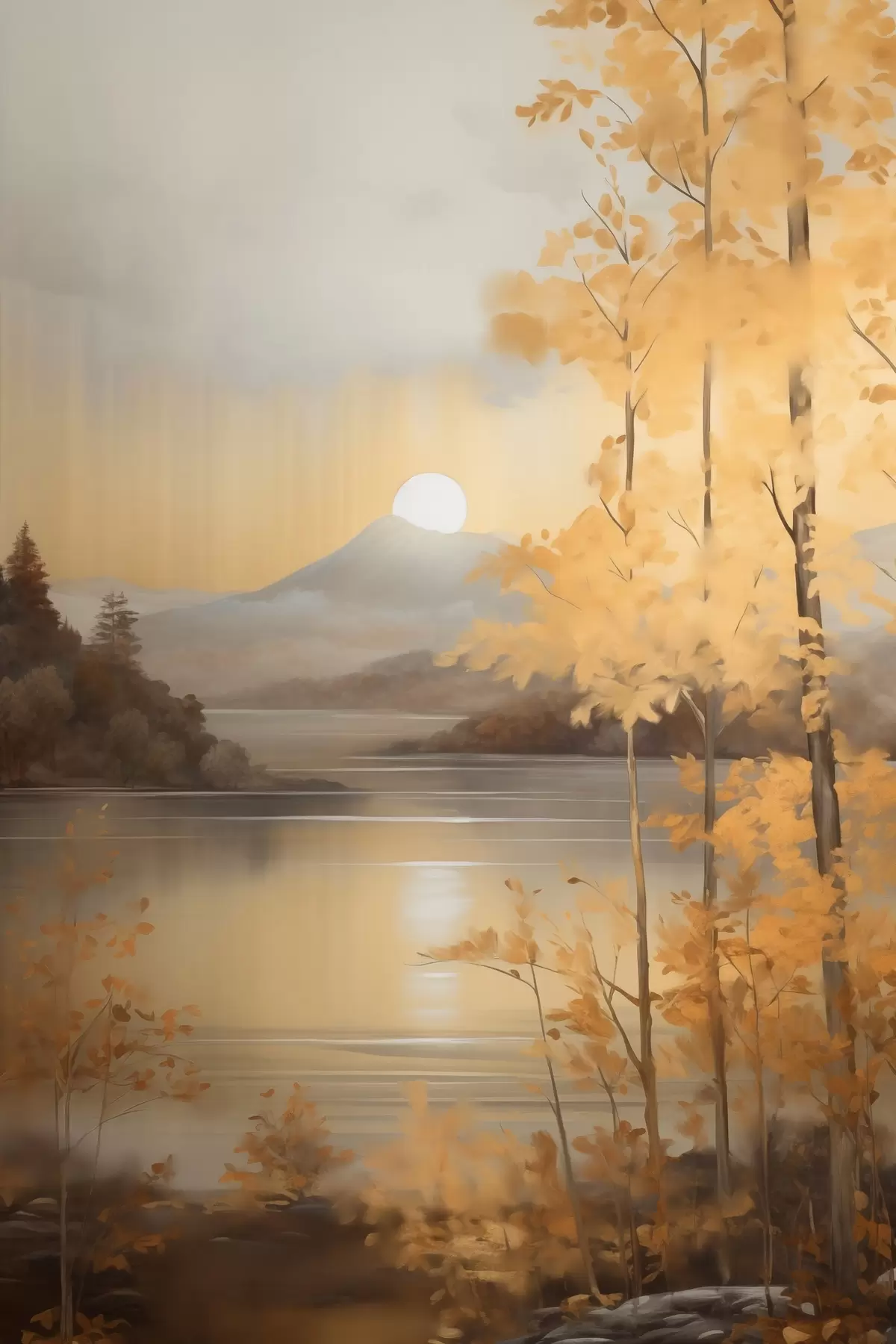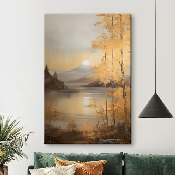 murales Árboles otoñales con hojas anaranjadas enmarcan un lago tranquilo con montañas lejanas bajo un cielo nublado. s47440