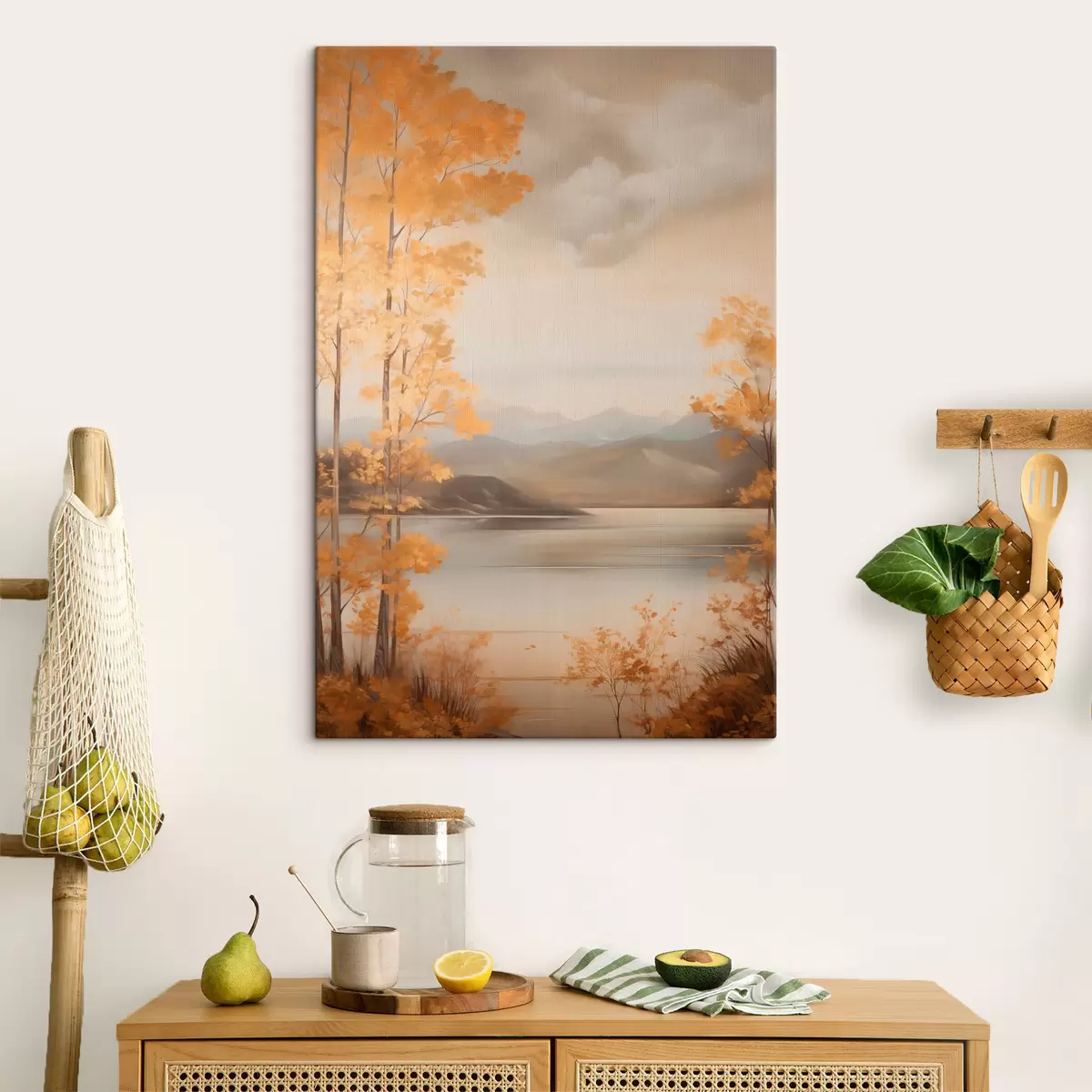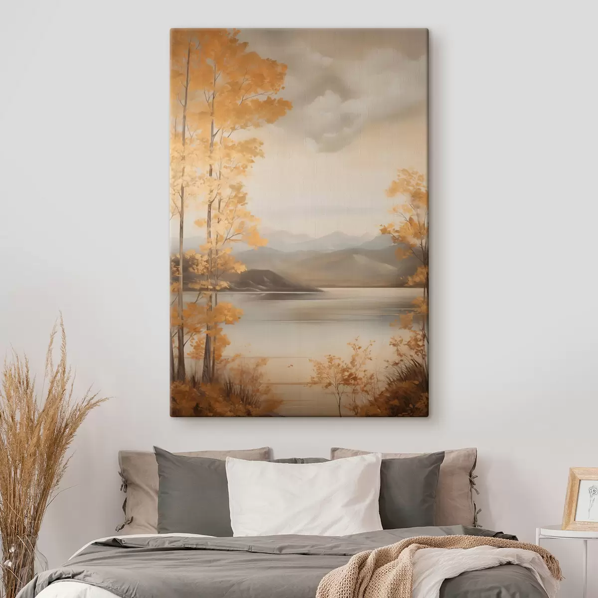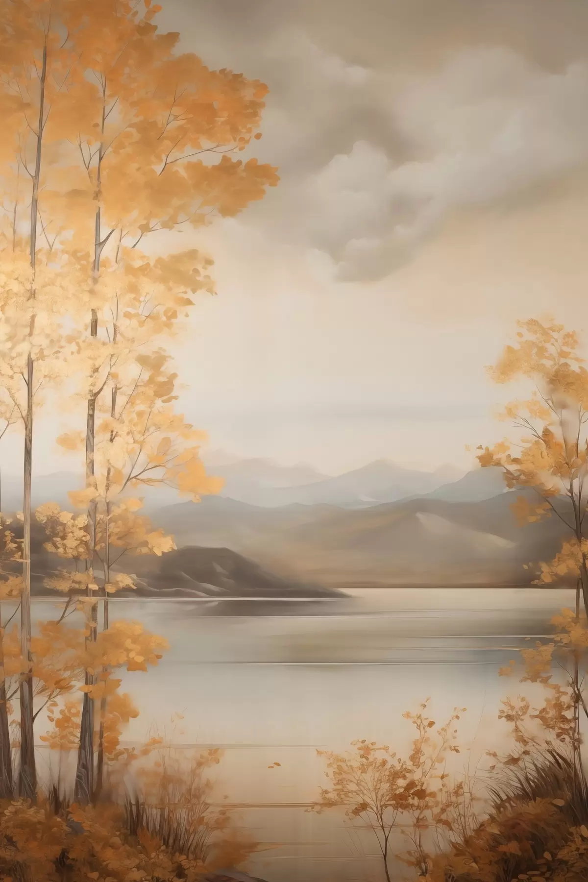 murales Árboles otoñales con hojas anaranjadas enmarcan un lago tranquilo con montañas lejanas bajo un cielo nublado. s47441