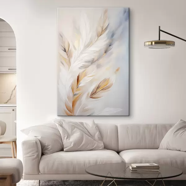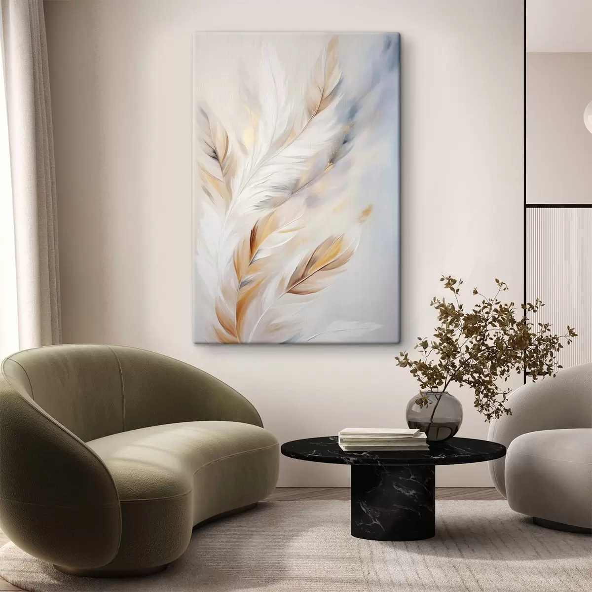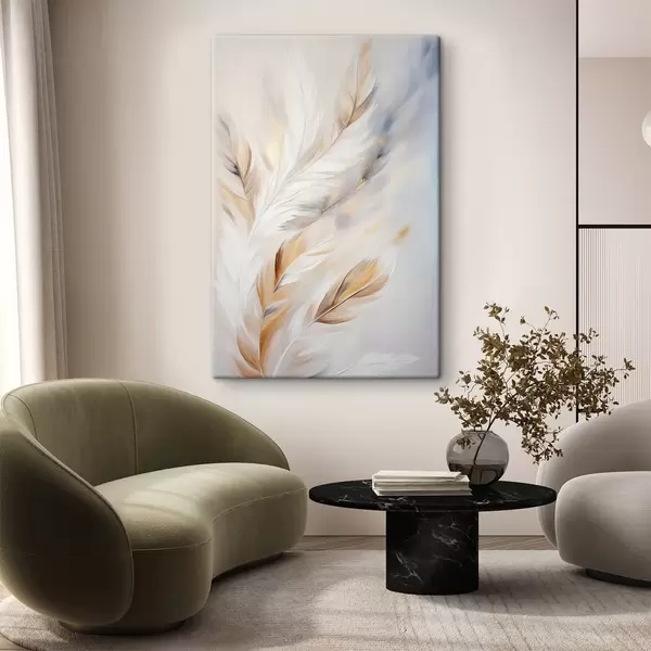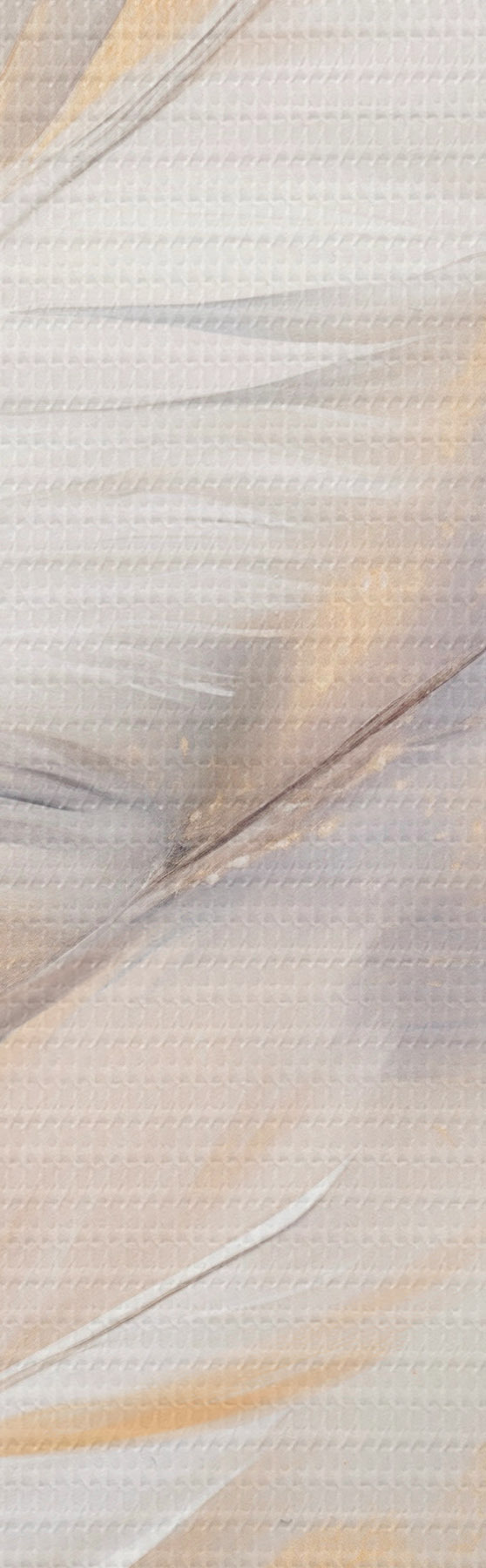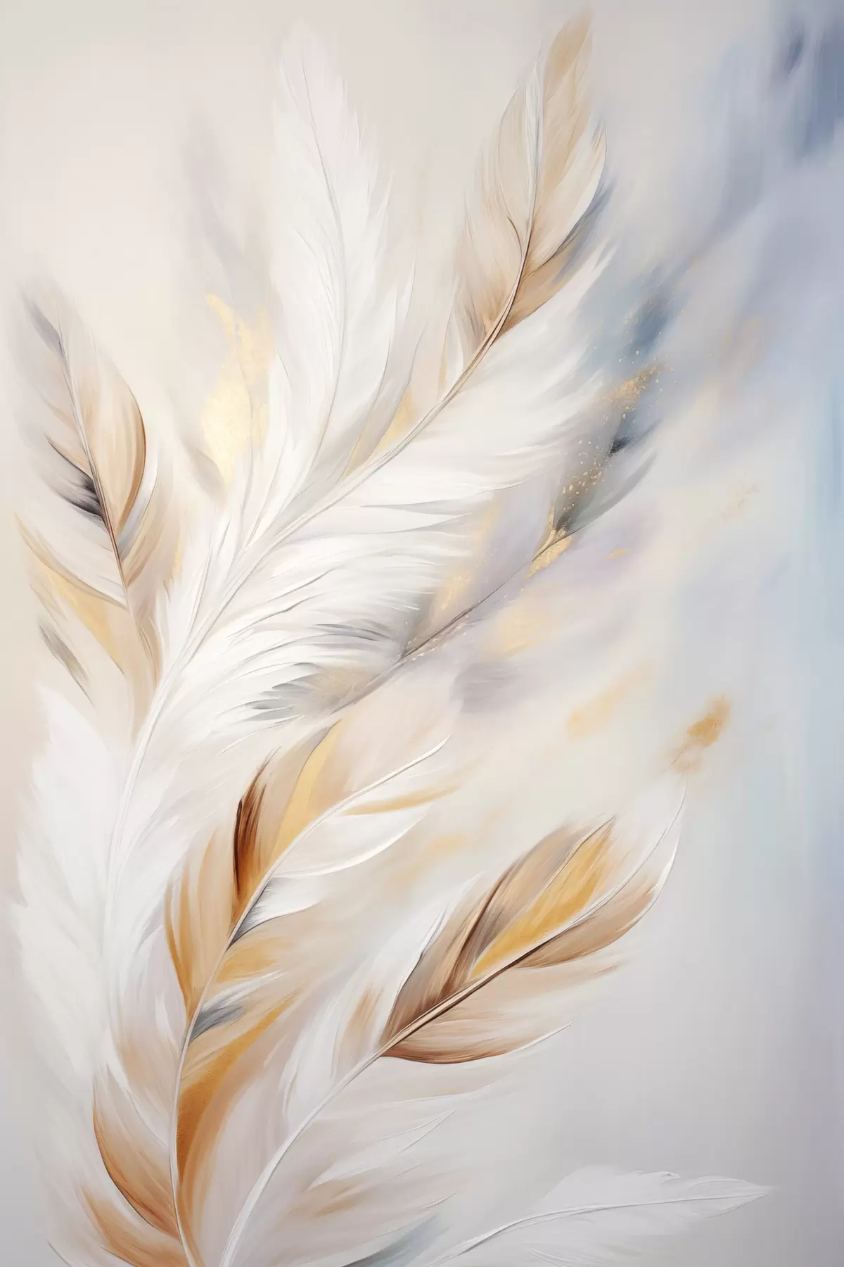 murales Plumas grandes y suaves con una mezcla de tonos blancos, amarillos y marrones, sobre un fondo claro y abstracto. s47443