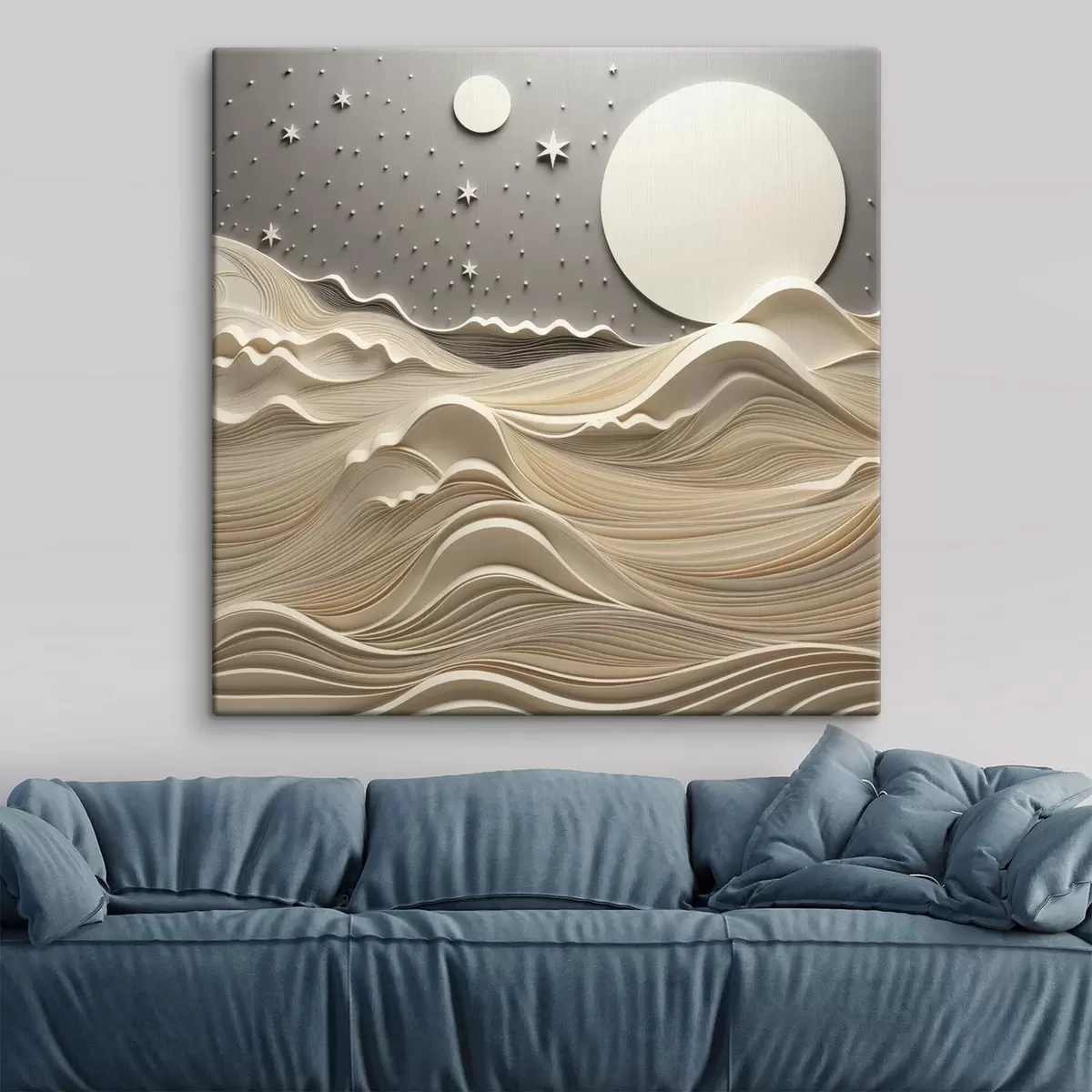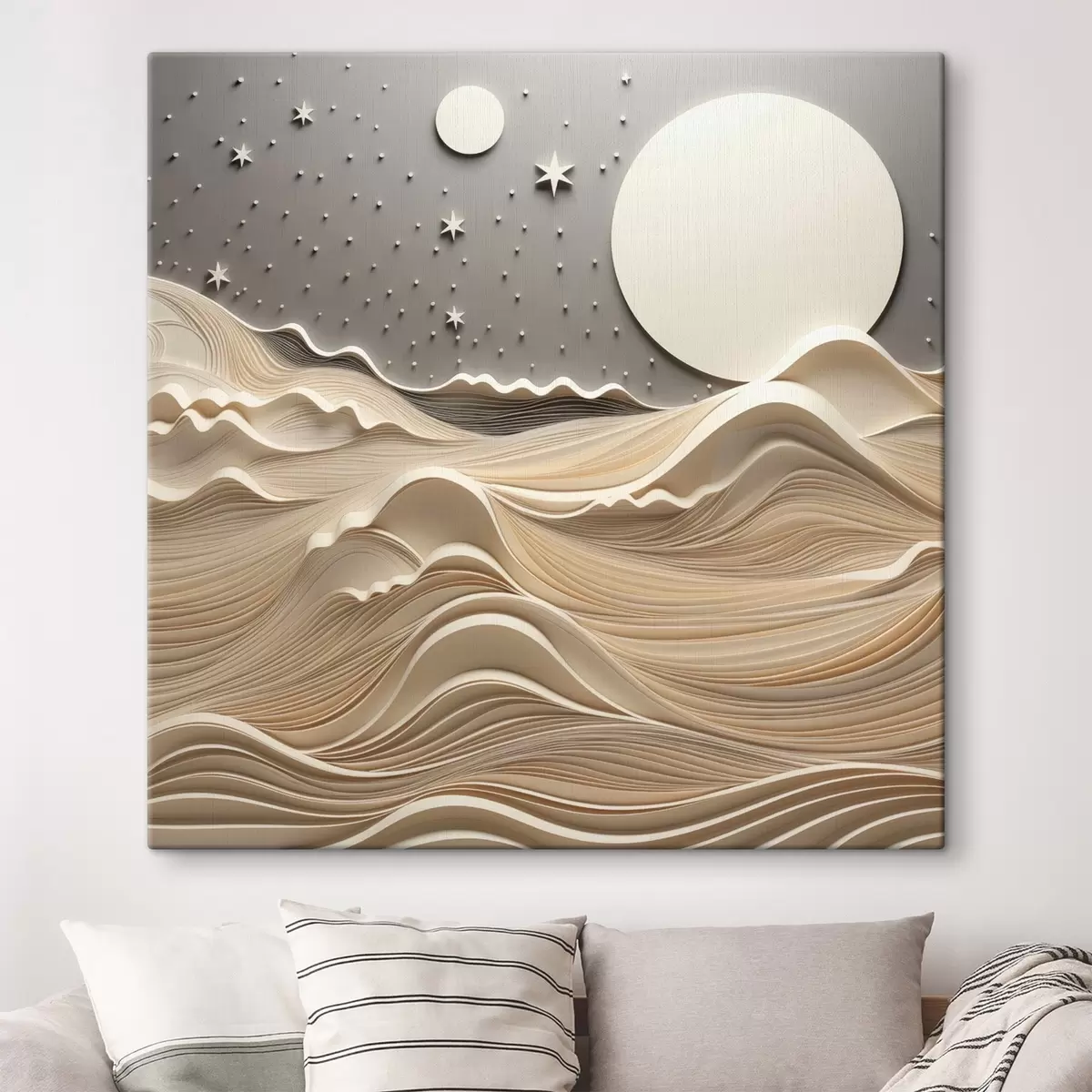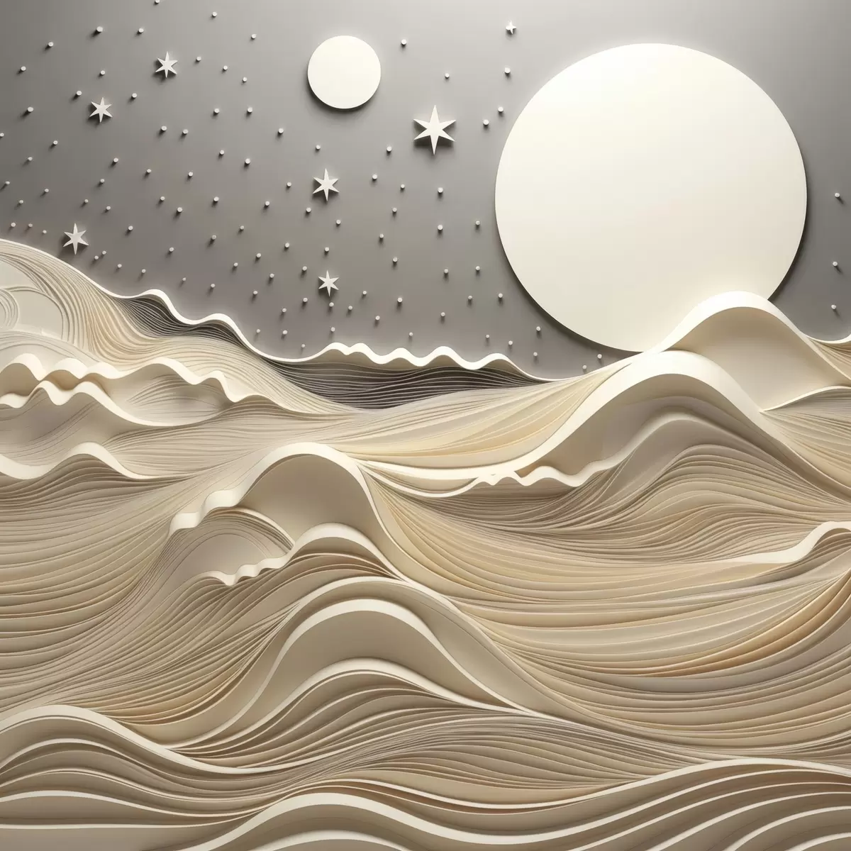 murales Un paisaje minimalista y estilizado con colinas onduladas y una gran luna en un cielo estrellado; arte abstracto s48401