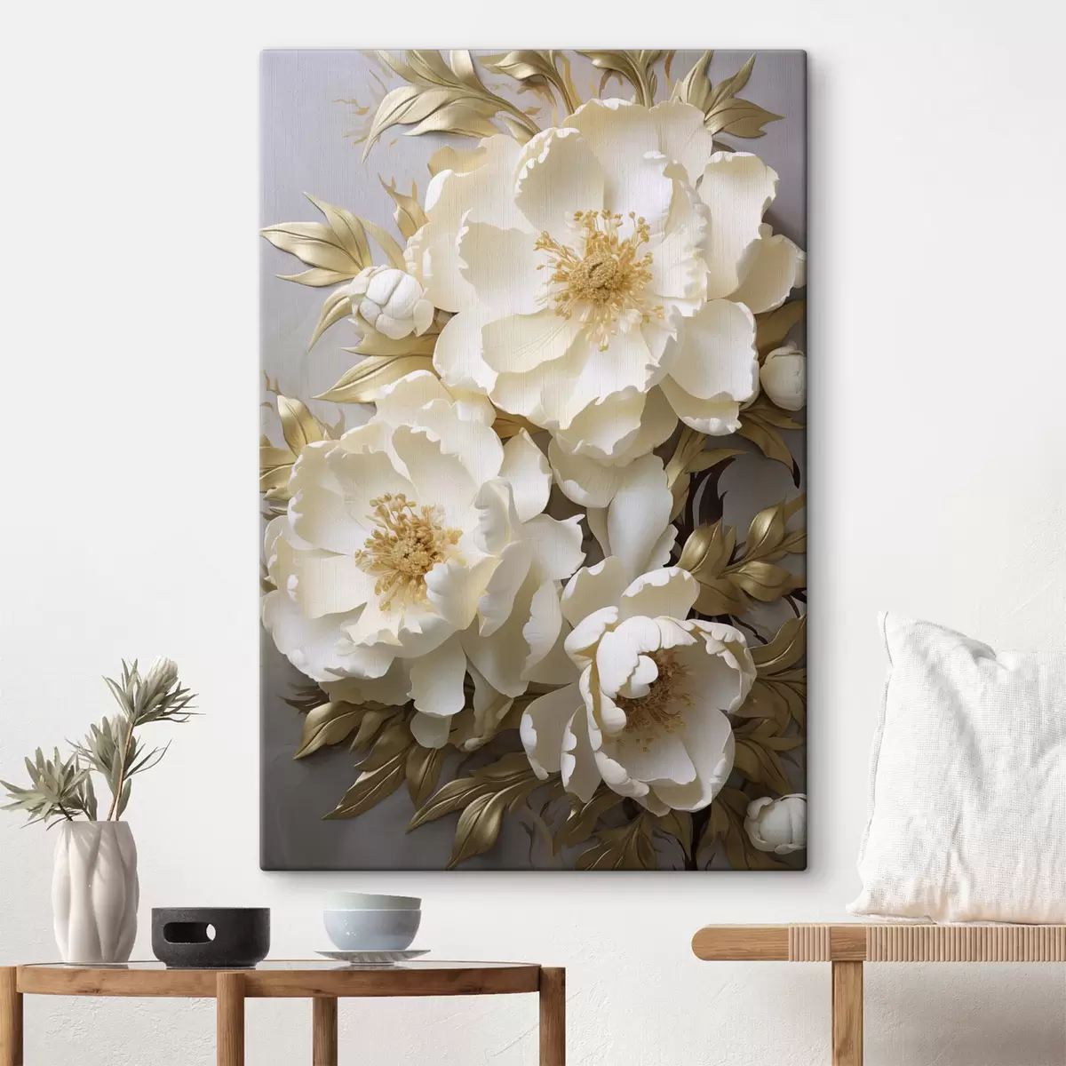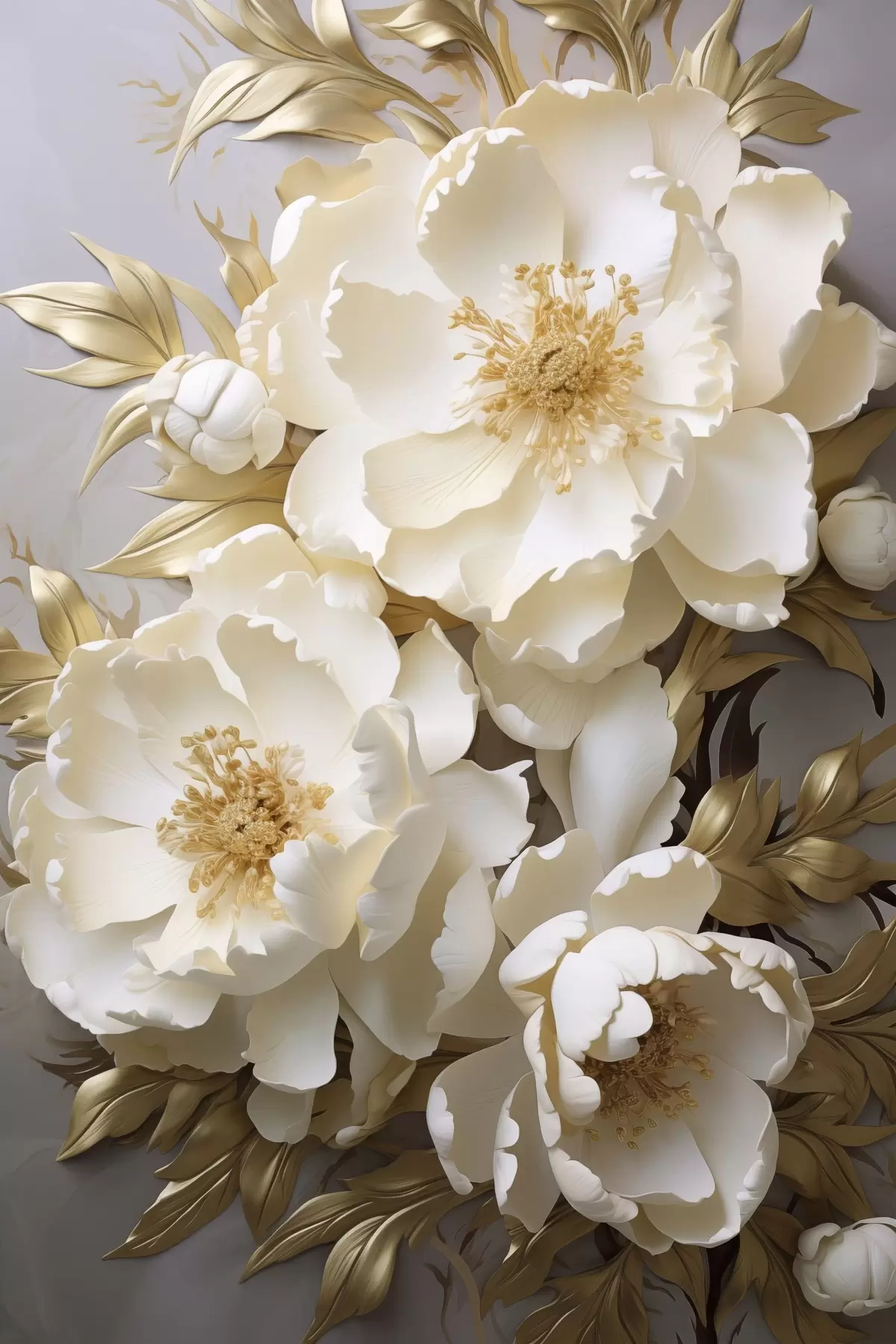 murales Grandes peonías blancas con hojas amarillas sobre un fondo gris s48754