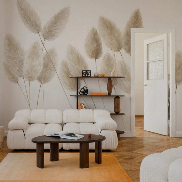 Formas abstractas grandes y fluidas con textura en colores crema y óxido con delicadas plumas amarillas, beige y marrones