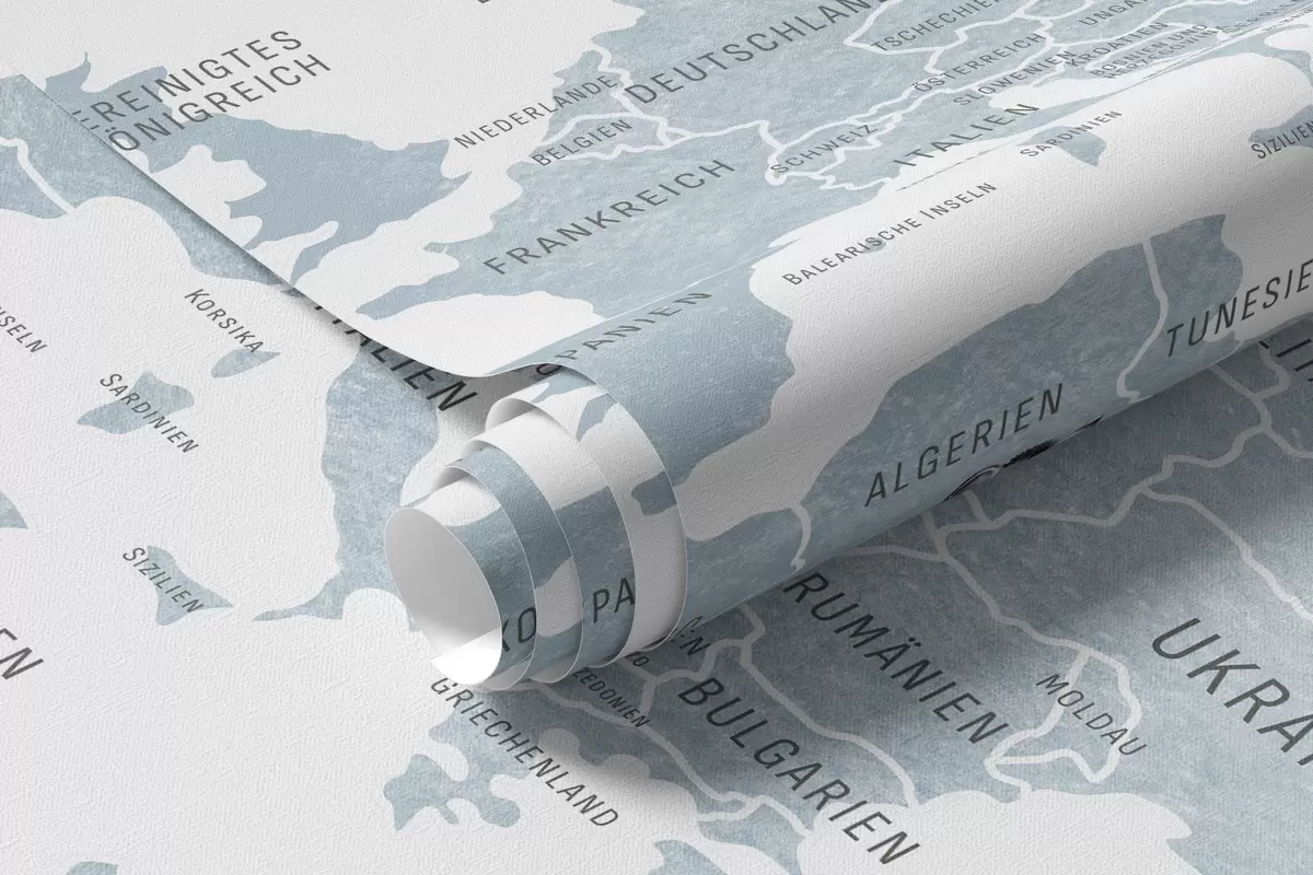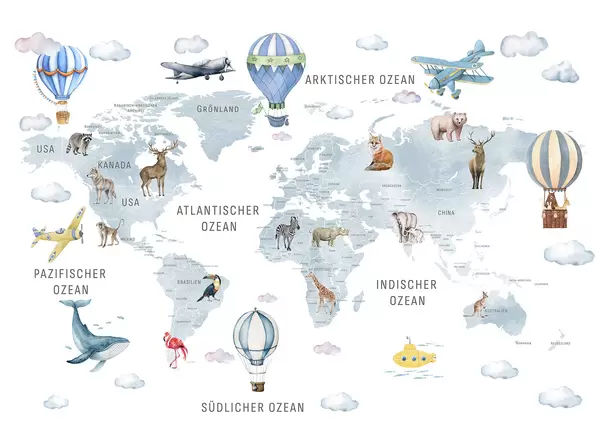 Papel de pared Mapa infantil en estilo acuarela con animales y globos aerostáticos. En alemán. Color azul. Nr. c00001dev1