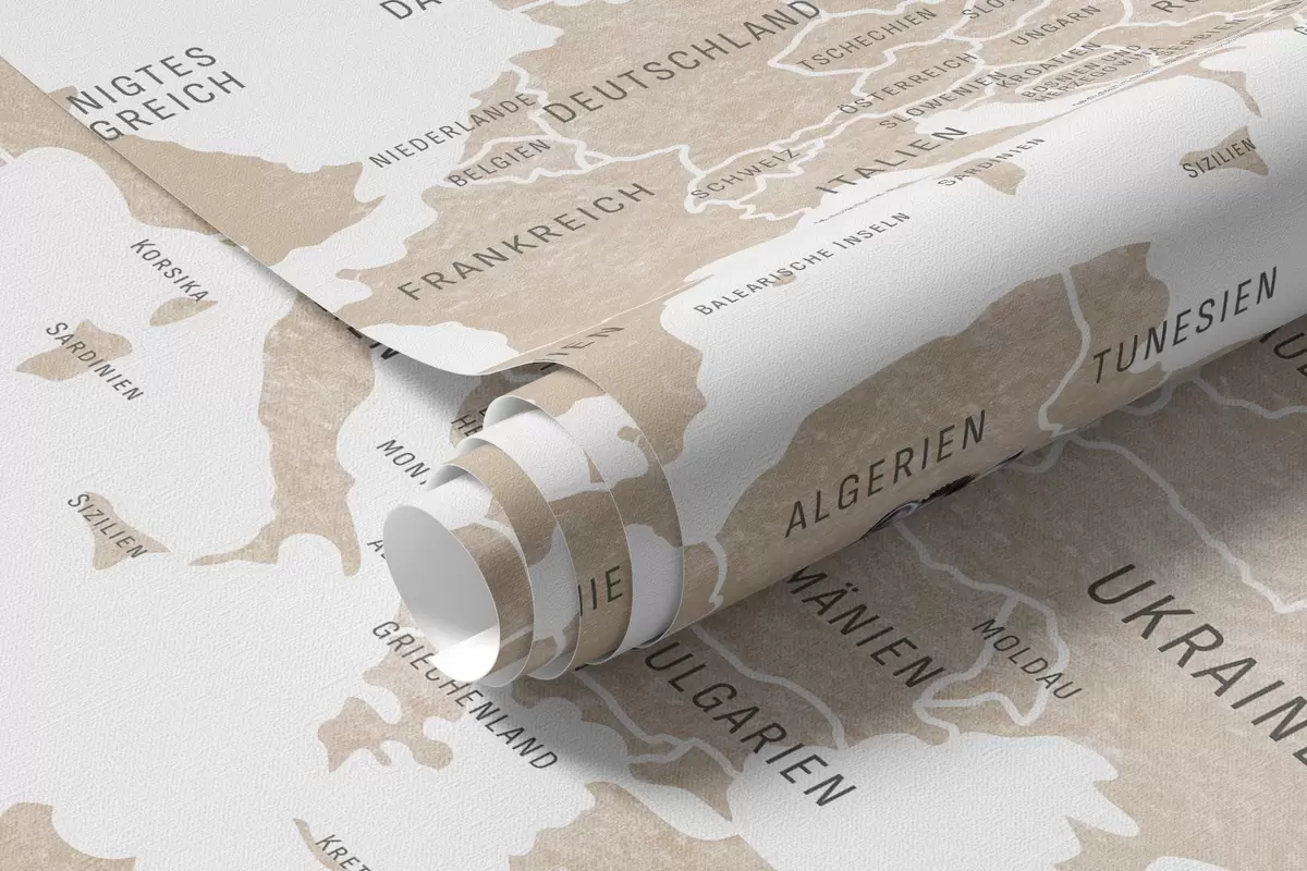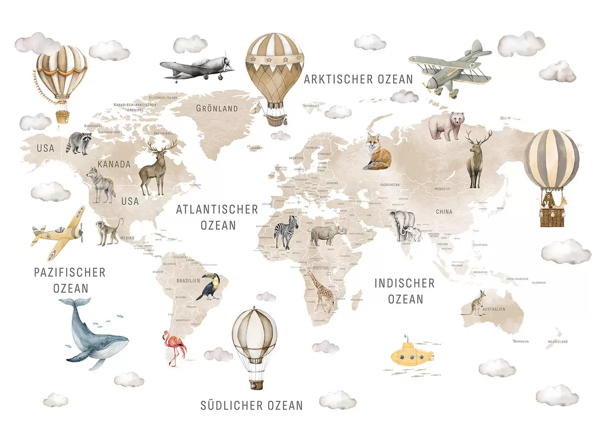 Papel de pared Mapa infantil en estilo acuarela con animales y globos aerostáticos. En alemán. Color beige. Nr. c00001dev2