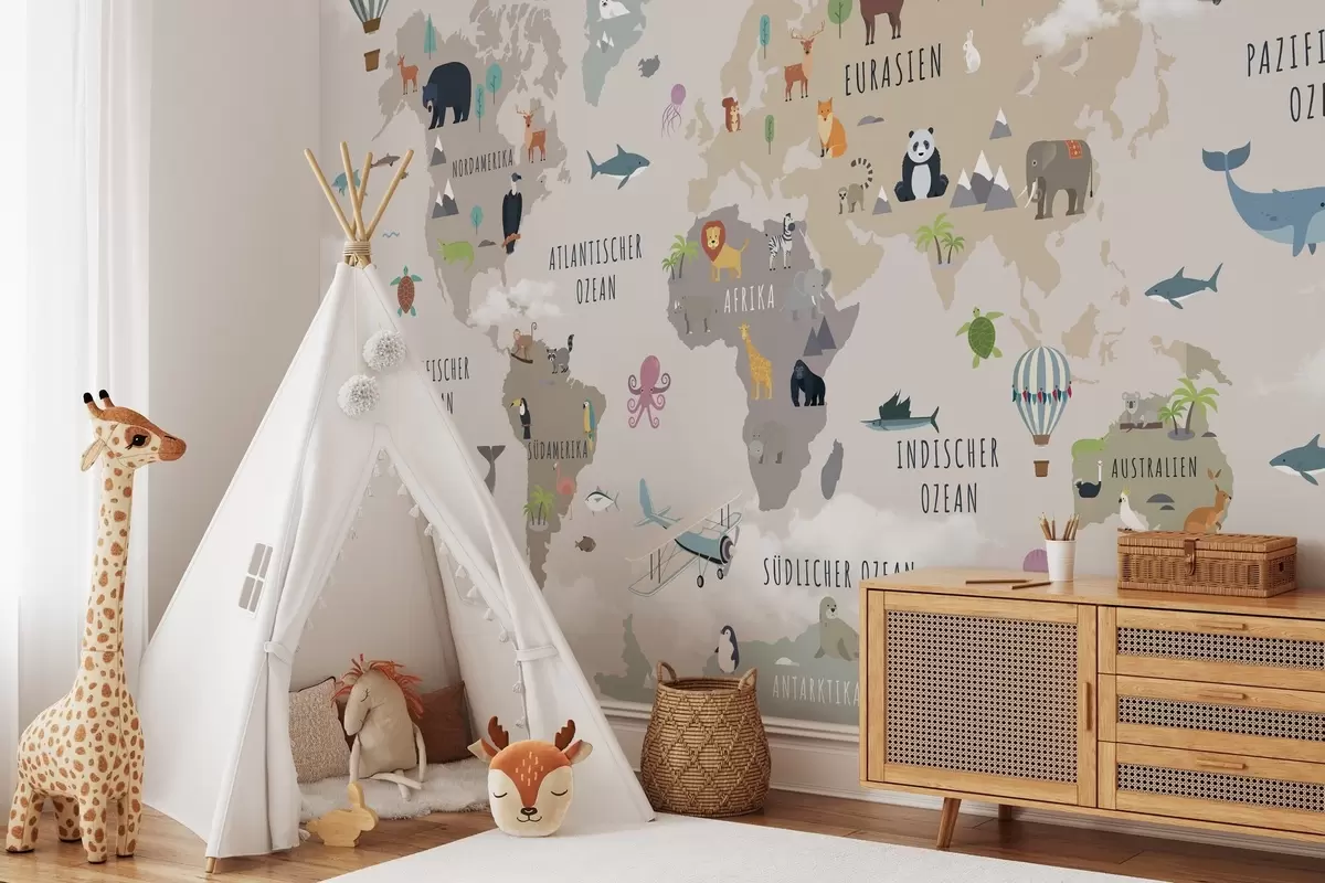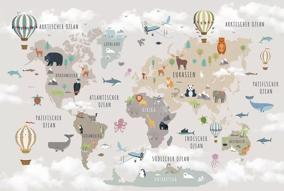Papel de pared Mapa mundial infantil con animales y globos aerostáticos. Idioma alemán. Nr. c00002de