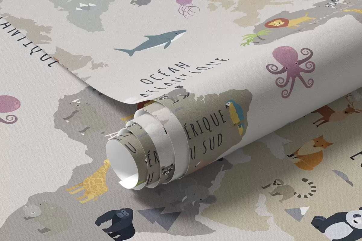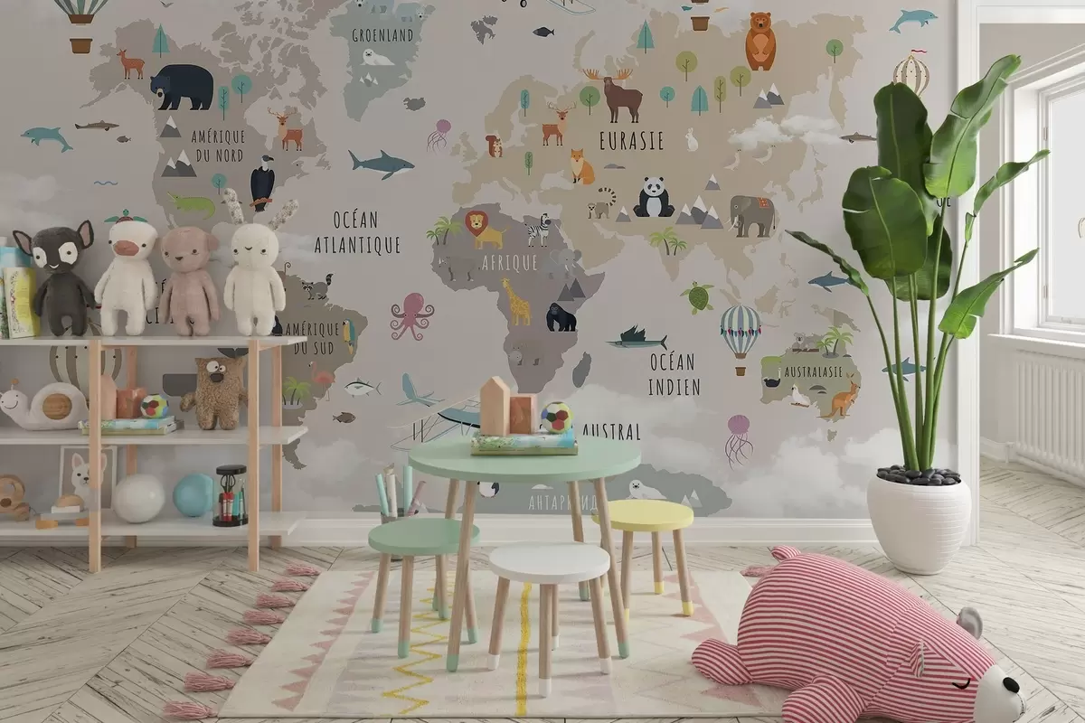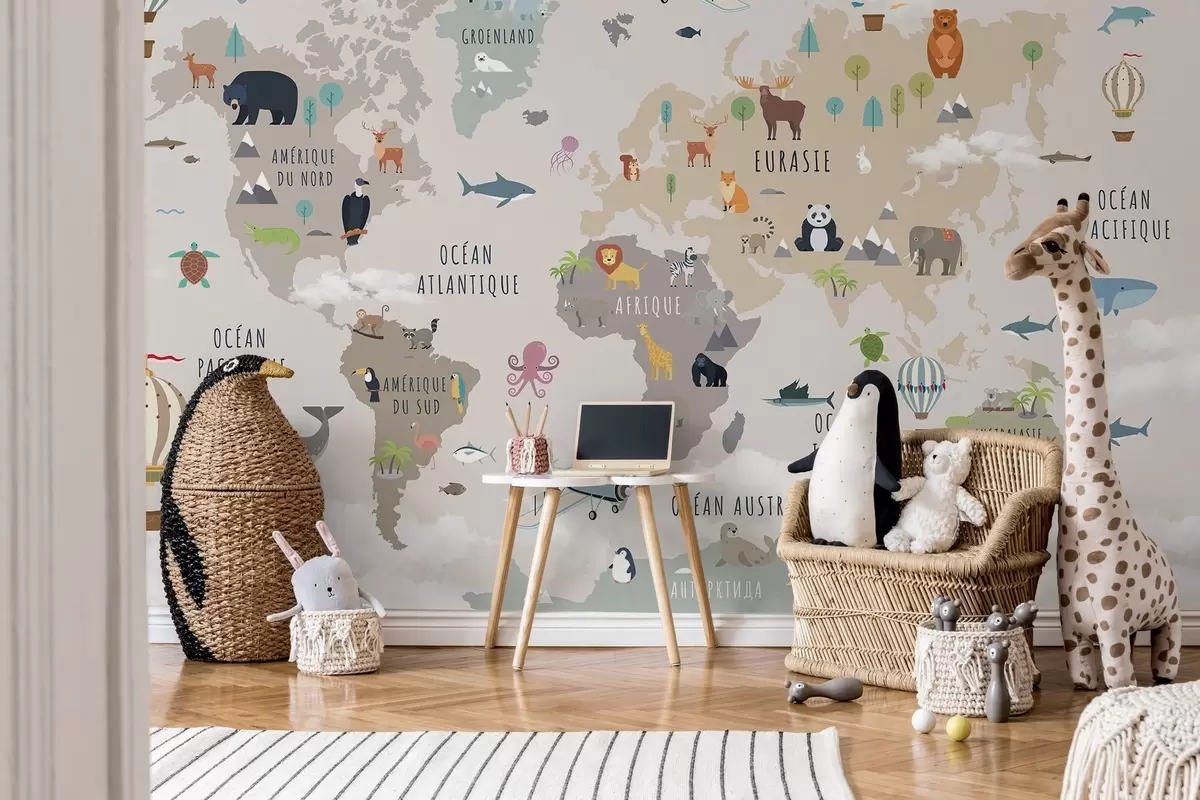 Papel de pared Mapa del mundo infantil con animales y globos aerostáticos. Idioma francés. Nr. c00002fr