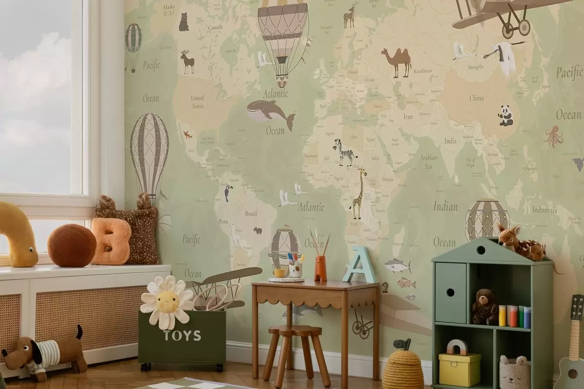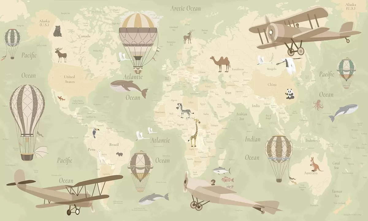 Papel de pared Mapa mundial infantil con animales, aviones y globos aerostáticos. En inglés. Color verde. Nr. c00003env2