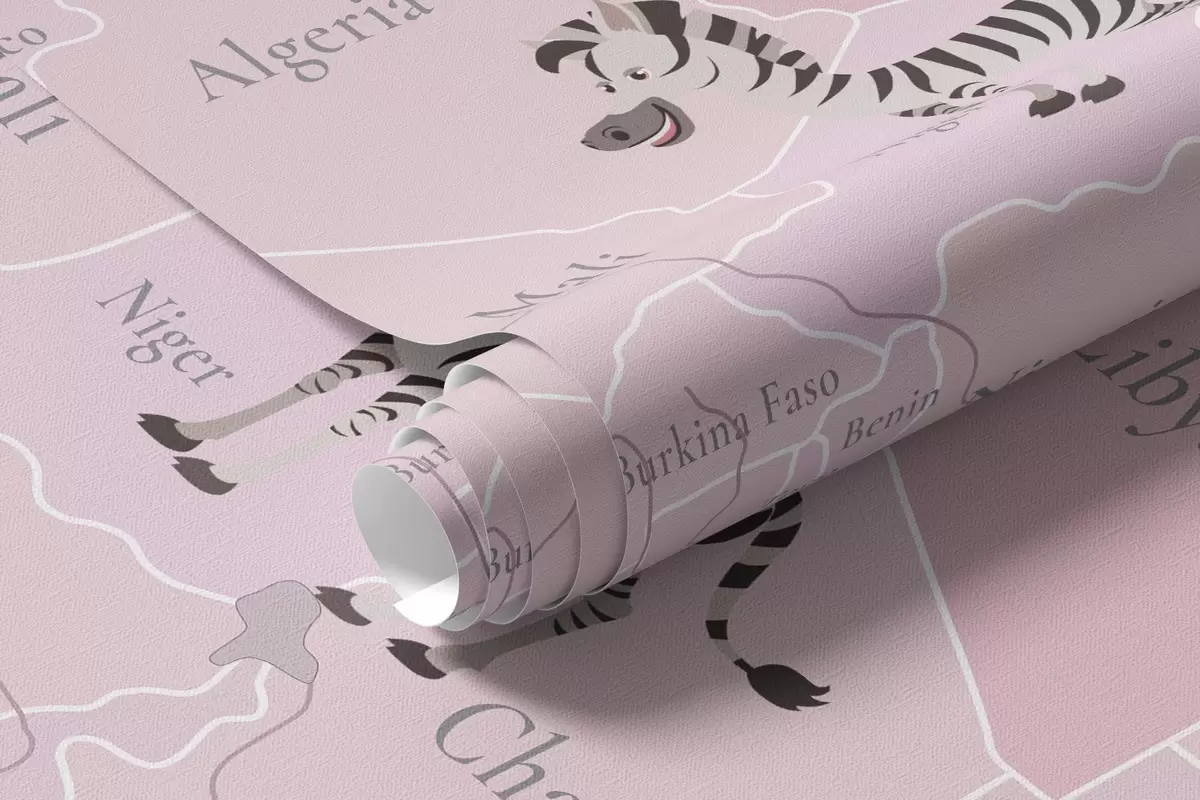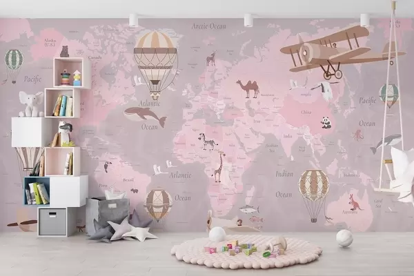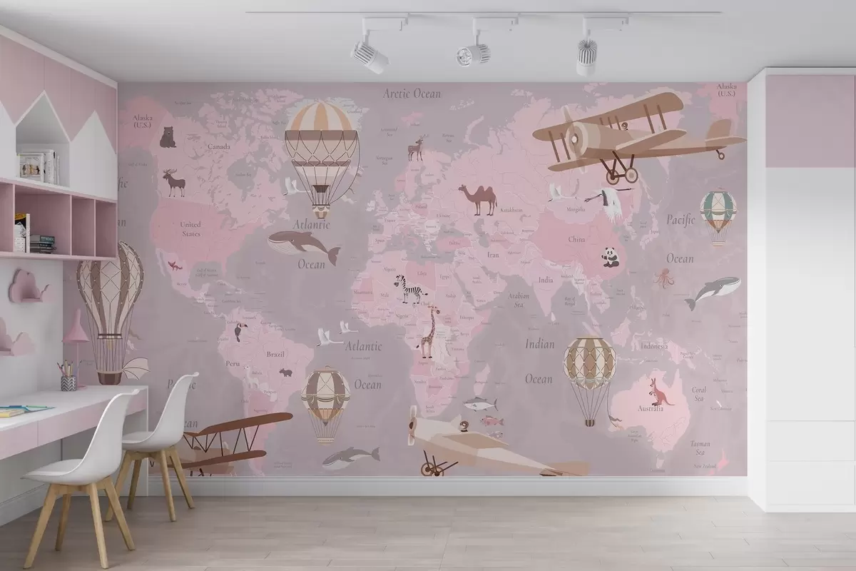 Papel de pared Mapa mundial infantil con animales, aviones y globos aerostáticos. En inglés. Color rosa. Nr. c00003env3