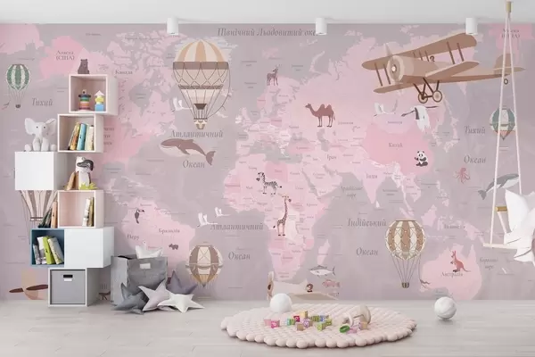 Papel de pared Mapa mundial infantil con animales, aviones y globos aerostáticos. Idioma ucraniano. Color rosa. Nr. c00003ukv3