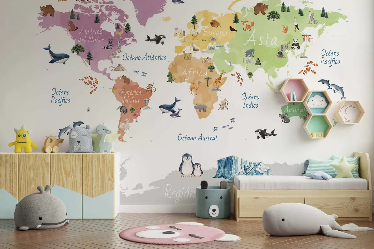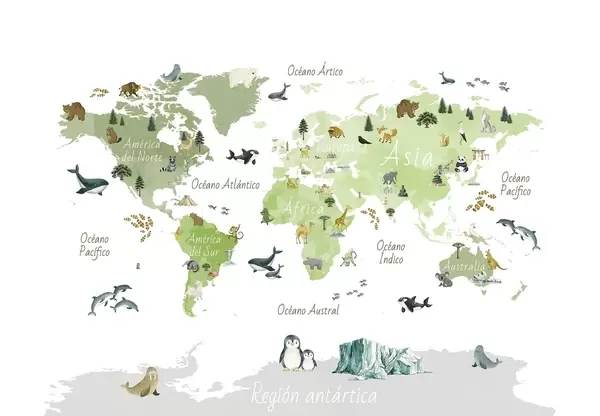 Papel de pared Un mapa a color con estilo de acuarela en el que aparecen animales, plantas y arquitectura. Etiquetas en español Nr. c00009es