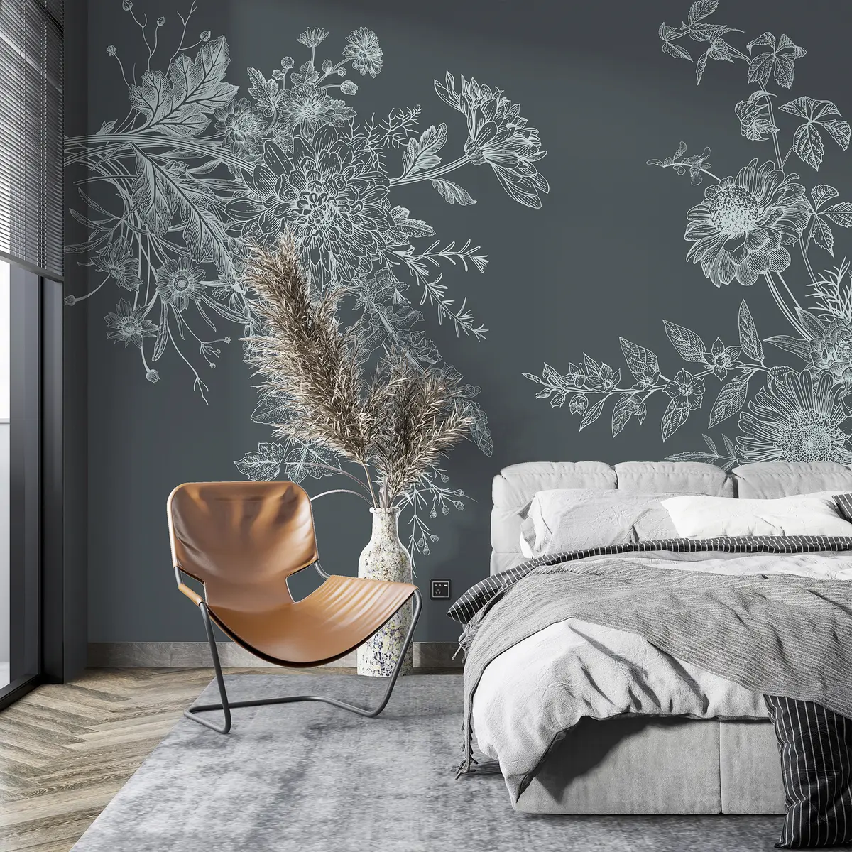 Papel de pared Ornamento floral, minimalismo, arte lineal, estilo boho, rústico, peonía, margarita, fondo azul oscuro Nr. w00381v1
