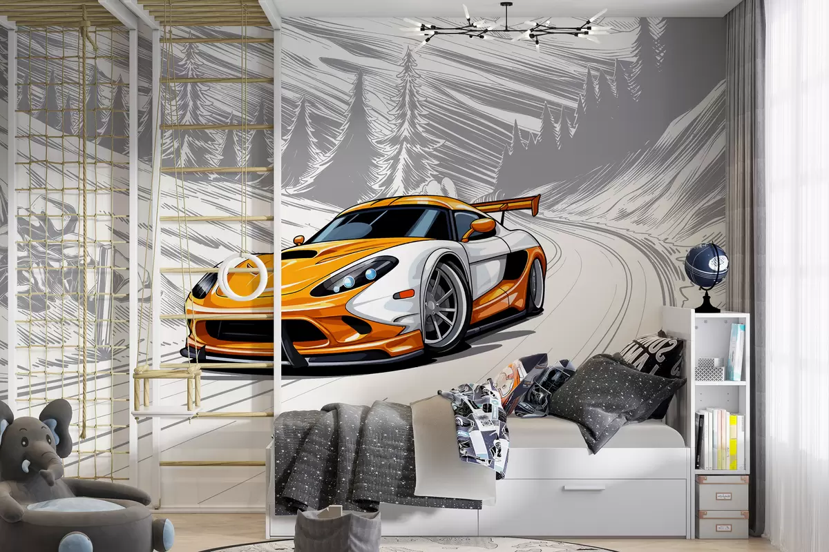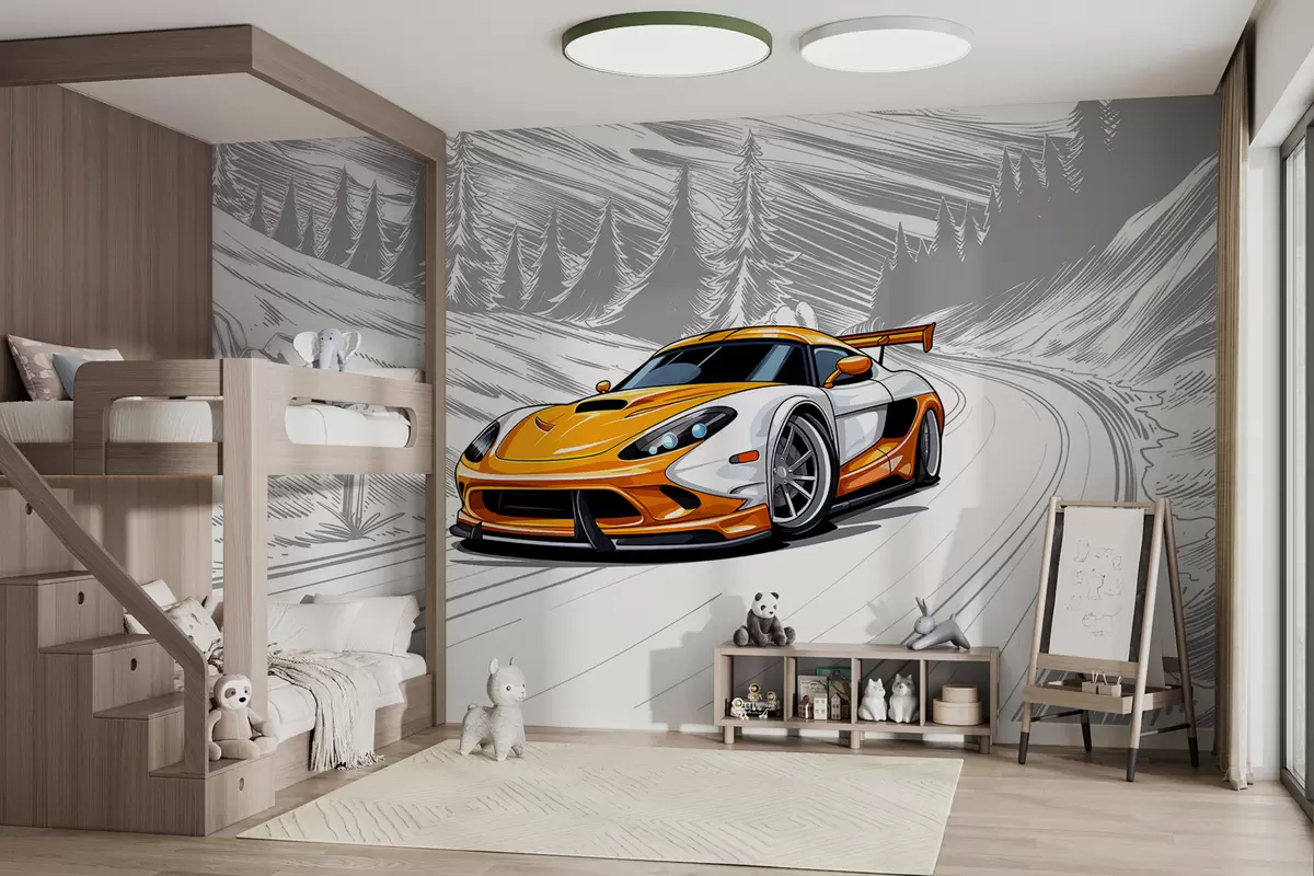 Papel de pared Un coche deportivo naranja sobre un fondo gris con una carretera llena de baches entre montañas y abetos. Para decorar la habitación de un niño Nr. w00954