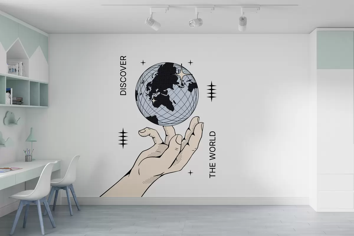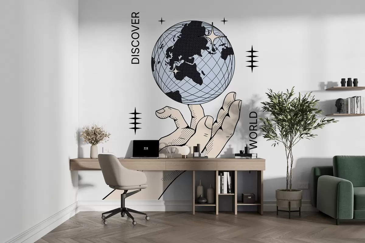 Papel de pared Mano beige girando el globo sobre un fondo blanco para la decoración de la habitación o la oficina Nr. w00984