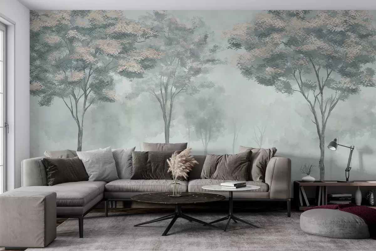 Papel de pared Silueta de bosque brumoso en colores verde, gris claro y beige Nr. w01599