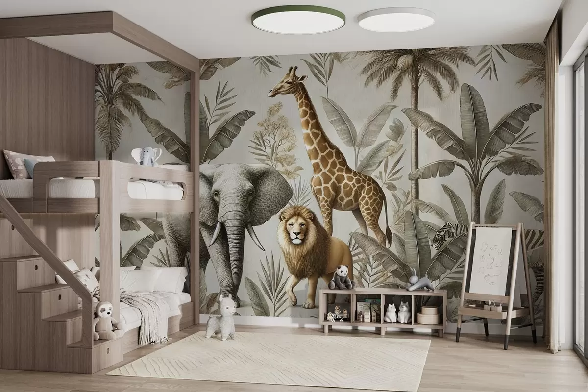 Papel de pared Papel pintado infantil Safari con paisaje tropical y varios animales en elegantes colores Nr. w01956