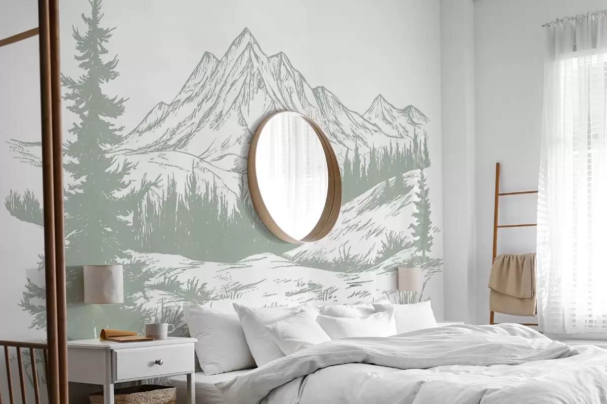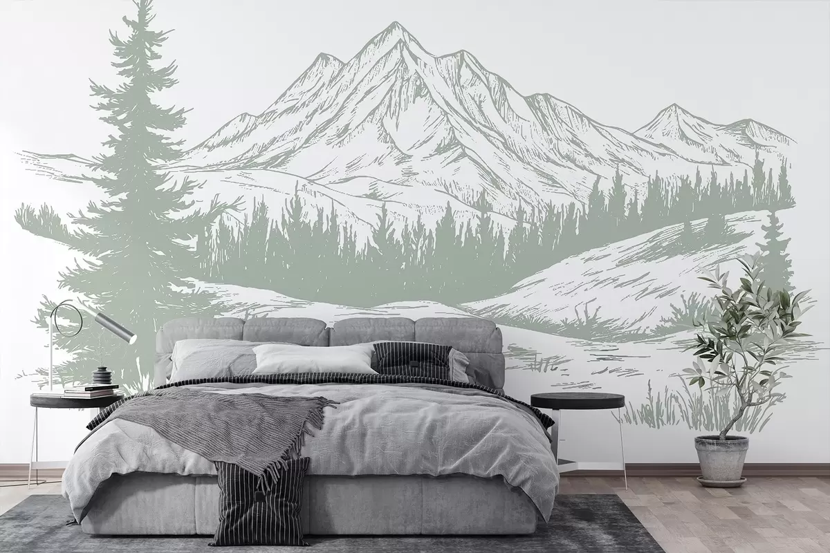Papel de pared Paisaje de montaña con pinos, bosque, naturaleza, color verde suave Nr. w03344v1