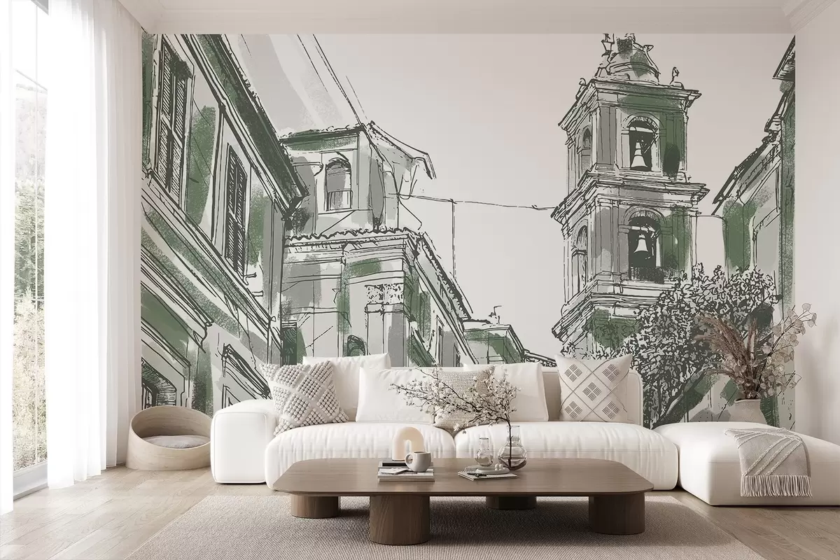 Papel de pared Calle de ciudad mediterránea, capilla, arquitectura, colores gris y verde Nr. w03350v2