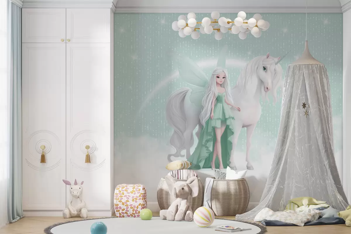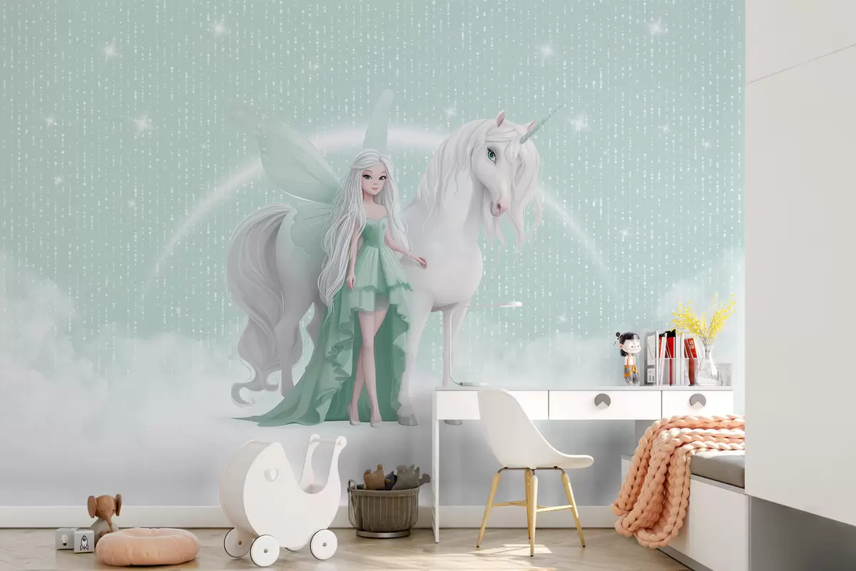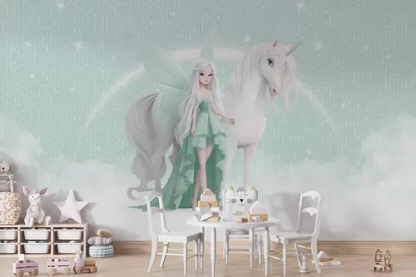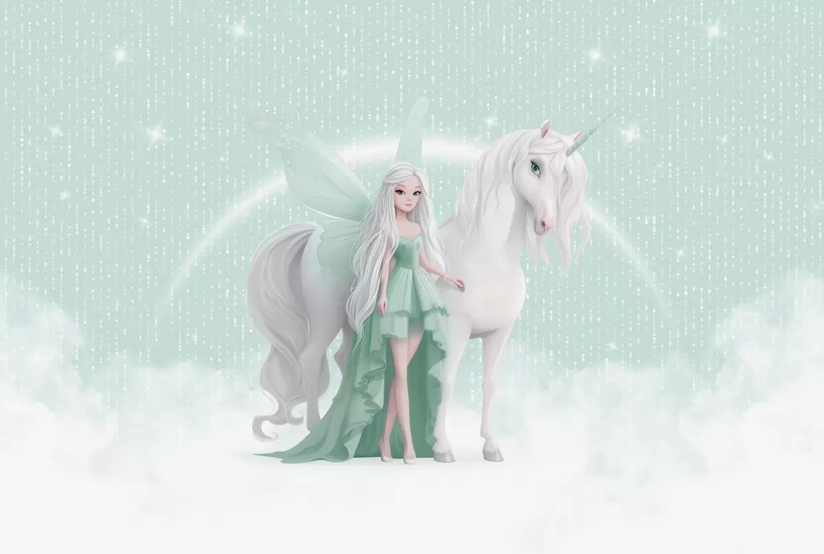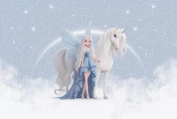 Papel de pared Un hada con un unicornio entre las nubes Nr. w03527v2
