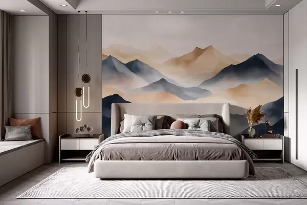 Papel de pared Paisajes de montaña, estilo acuarela, bruma, beige y gris Nr. w03548