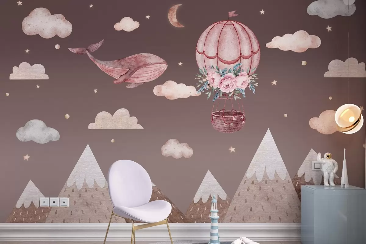 Papel de pared Ballena linda con globo de aire, cielo oscuro con nubes, montañas, acuarela, colores rosados Nr. w03673v1