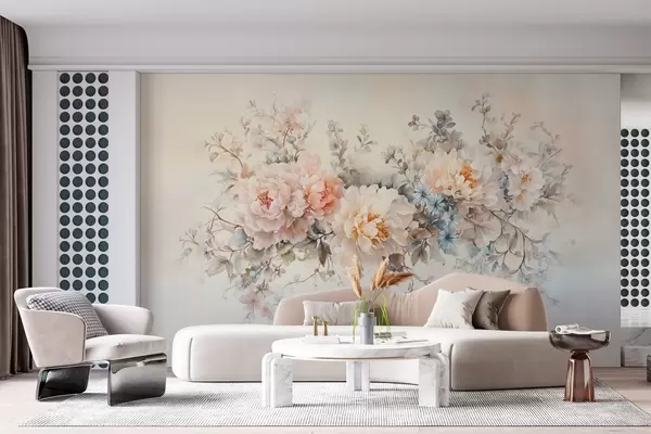 Papel de pared delicadas flores estilo acuarela en tonos pastel rosa, beige y azul Nr. w03724