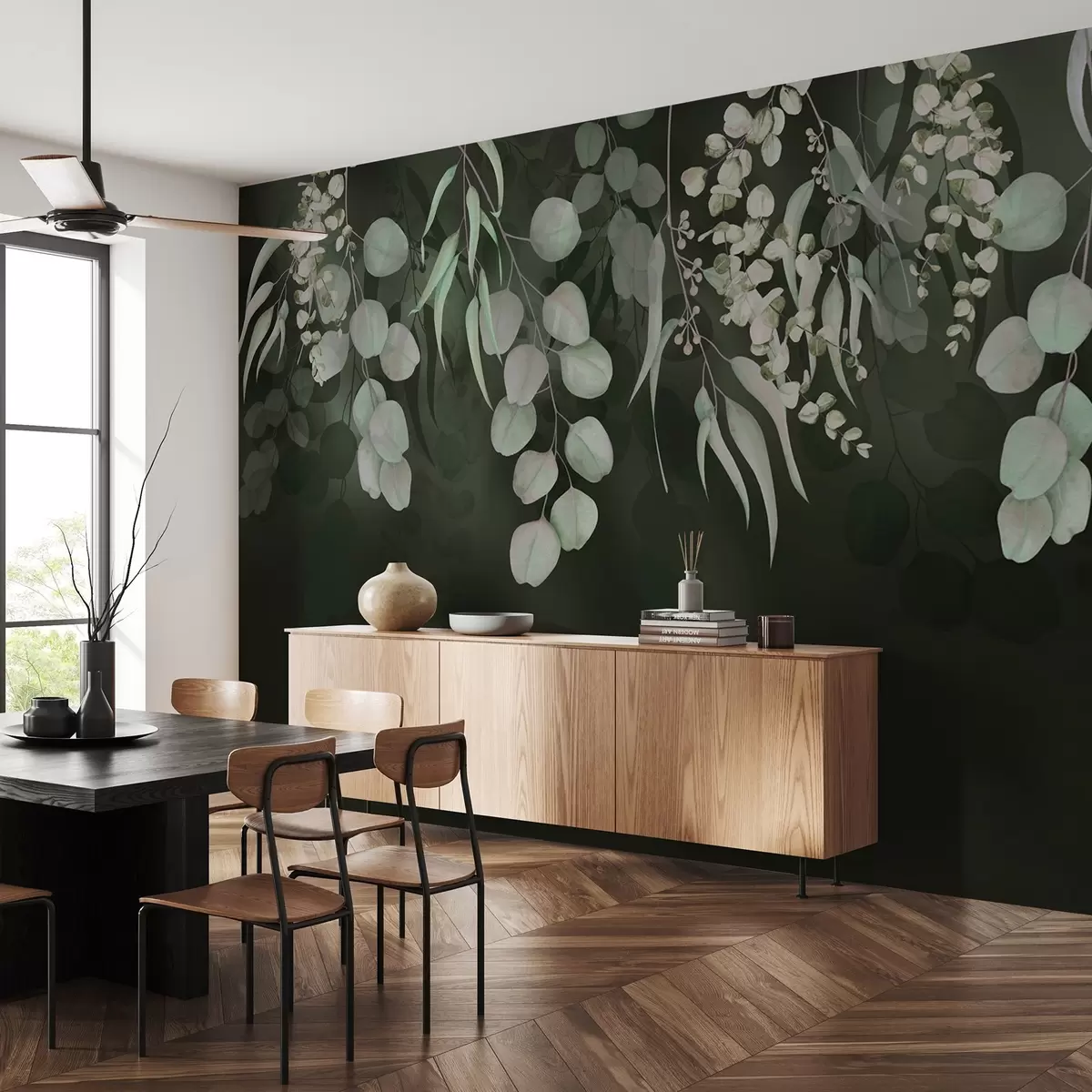 Papel de pared Hojas tropicales sobre fondo verde oscuro, floral Nr. w03752
