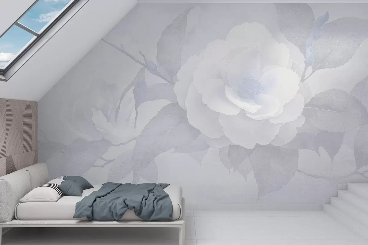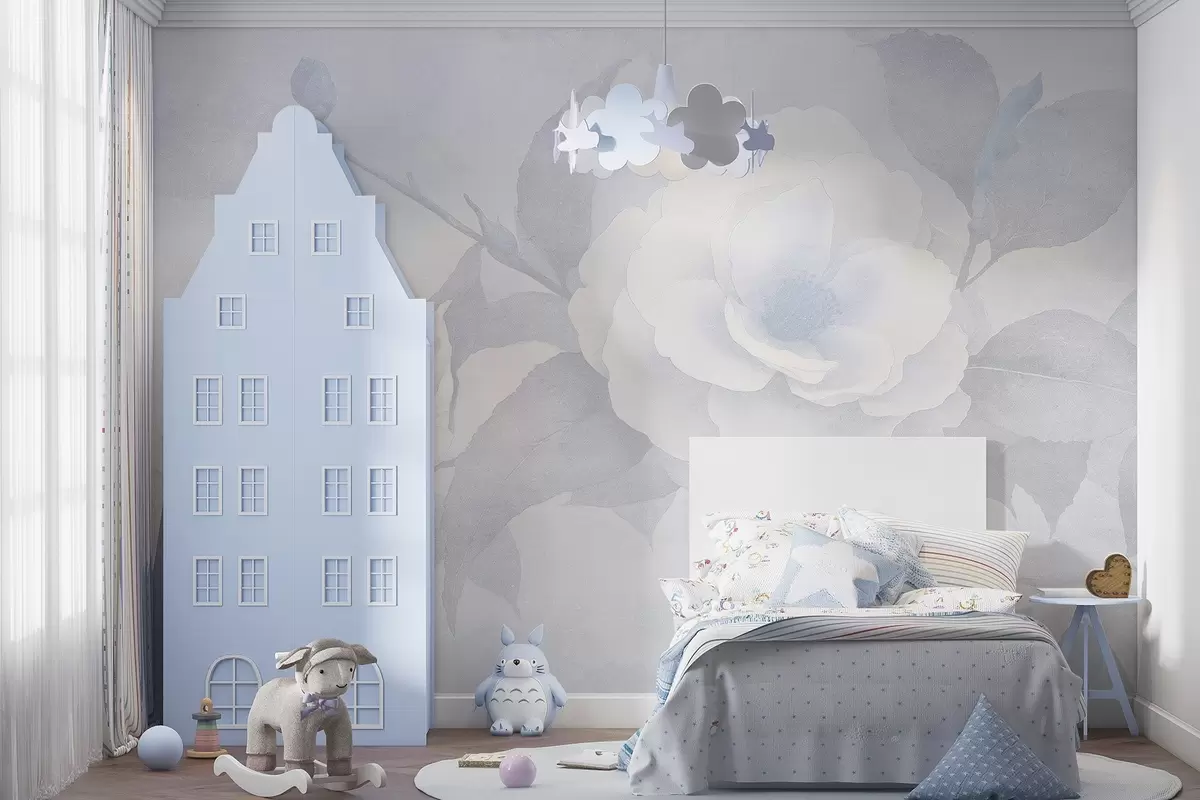 Papel de pared Pastel suave con flores de camelia en la rama, colores azules Nr. w03760v1