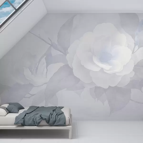 Papel de pared Pastel suave con flores de camelia en la rama, colores azules Nr. w03760v1