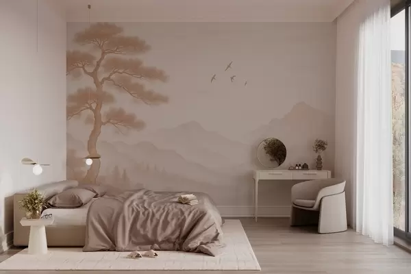 Papel de pared panorama de colinas con un gran árbol en tonos moca Nr. w04033v1