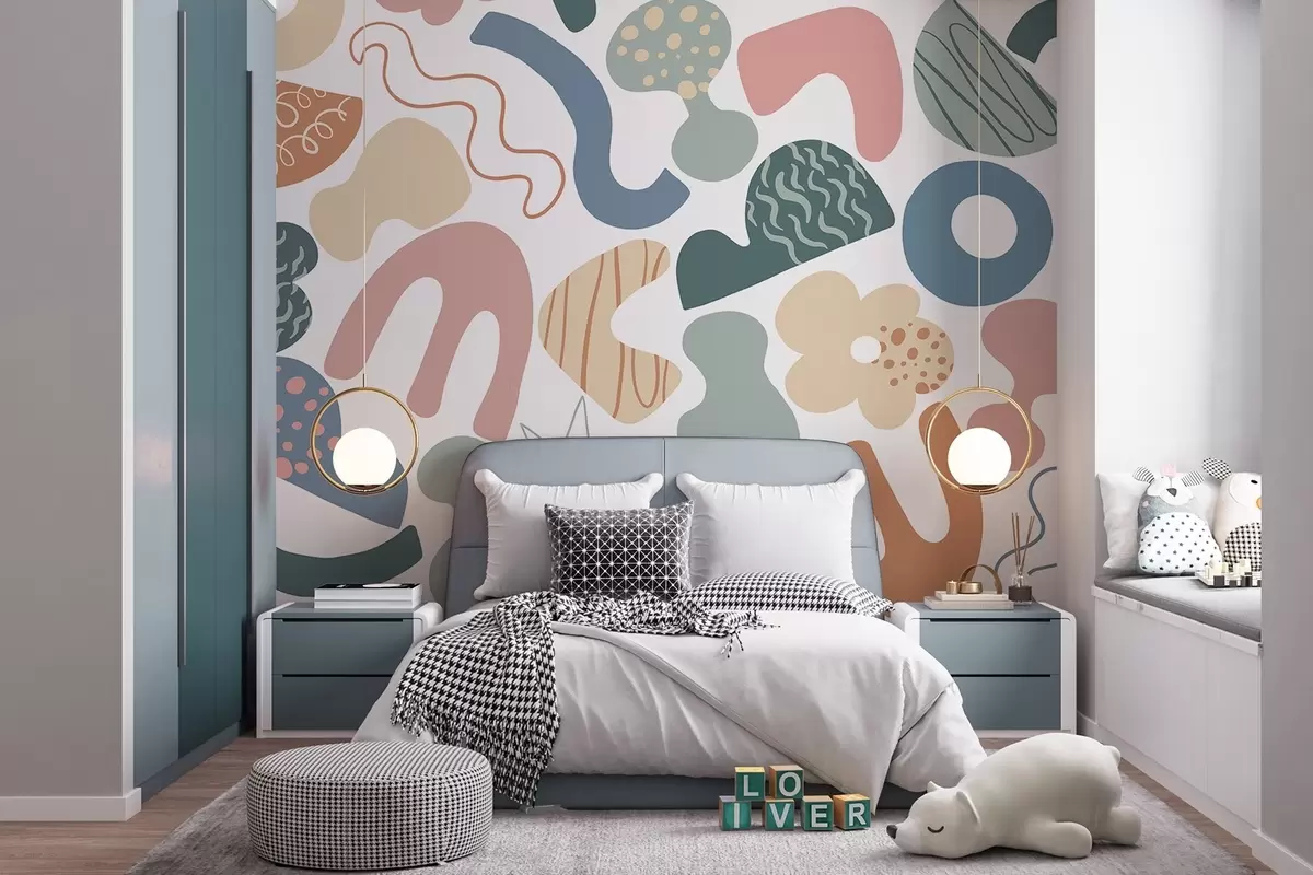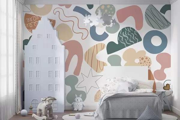Papel de pared Figuras geométricas con garabatos dibujo, juvenil, verde, rosa, azul Nr. w04068v2