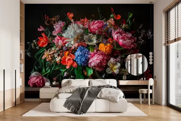 Papel de pared ramo al estilo de la pintura al óleo holandesa del siglo XVII con una lujosa composición floral. Nr. w04078