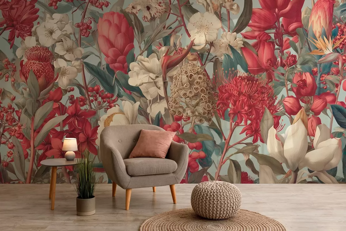 Papel de pared flores tropicales con textura sobre fondo azul Nr. w04209