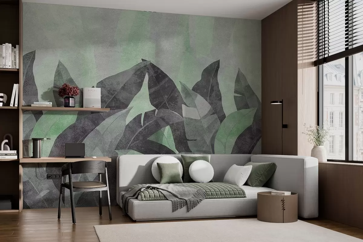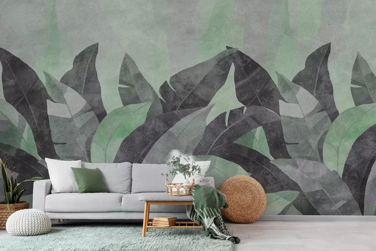 Papel de pared hojas de plátano texturizadas en tonos verdes y grises Nr. w04285v1
