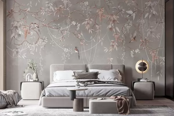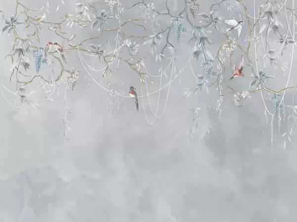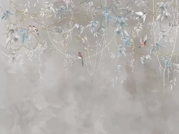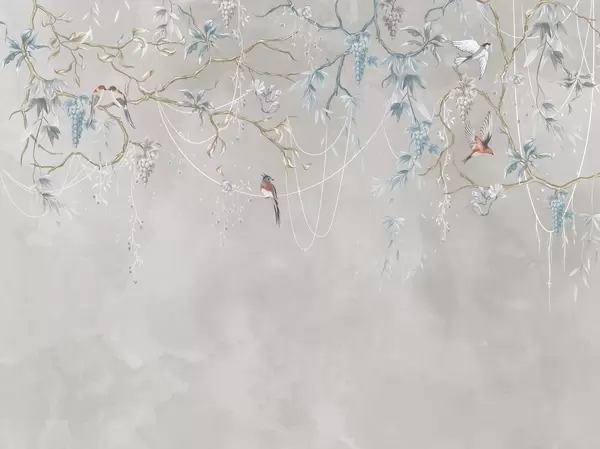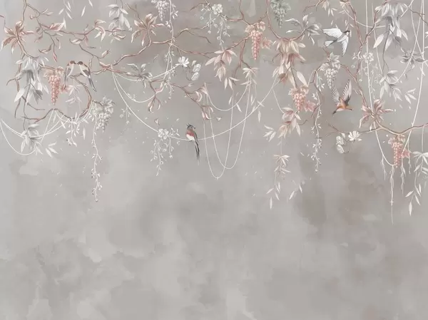 Papel de pared Ramas con uvas y pájaros sobre fondo gris rosado cálido Nr. w04302