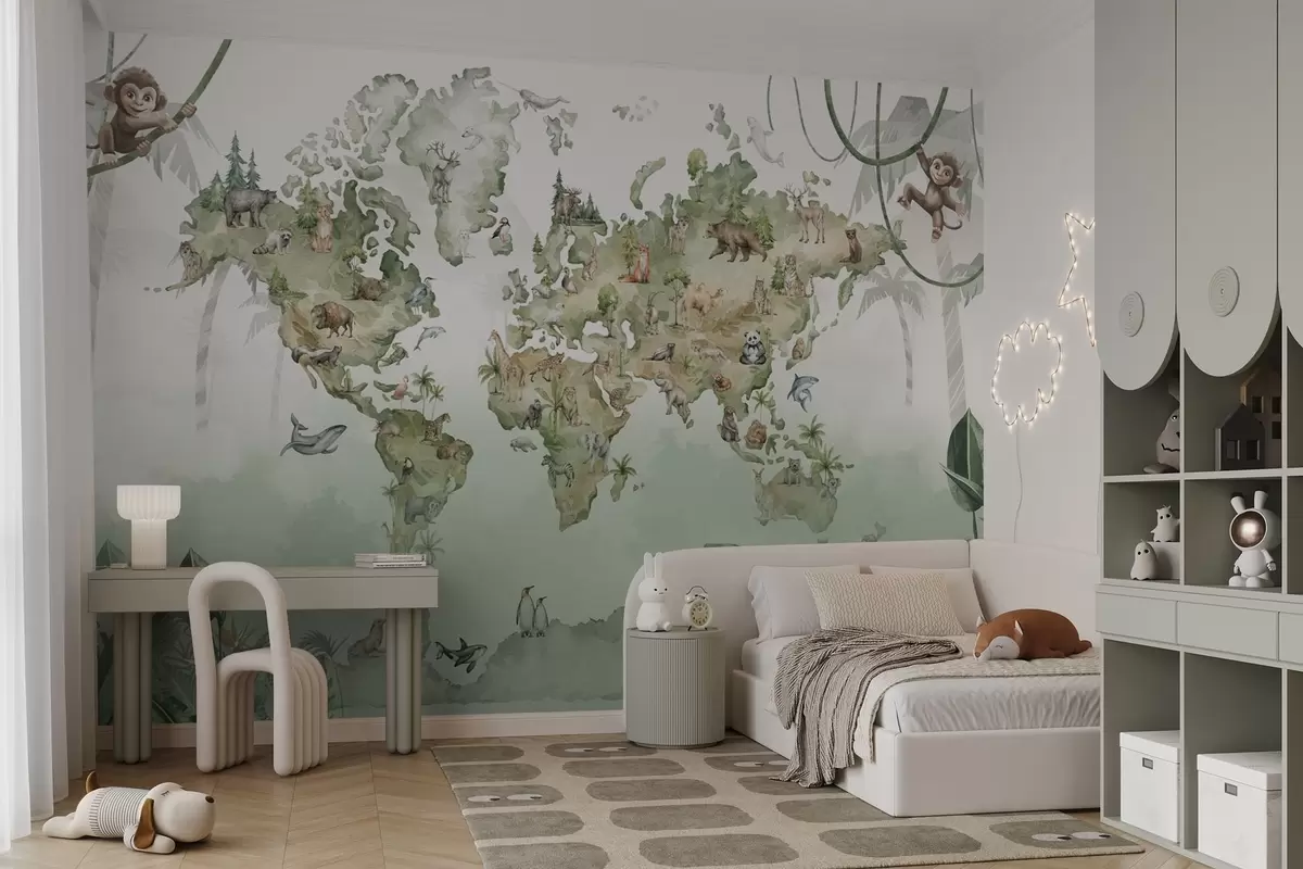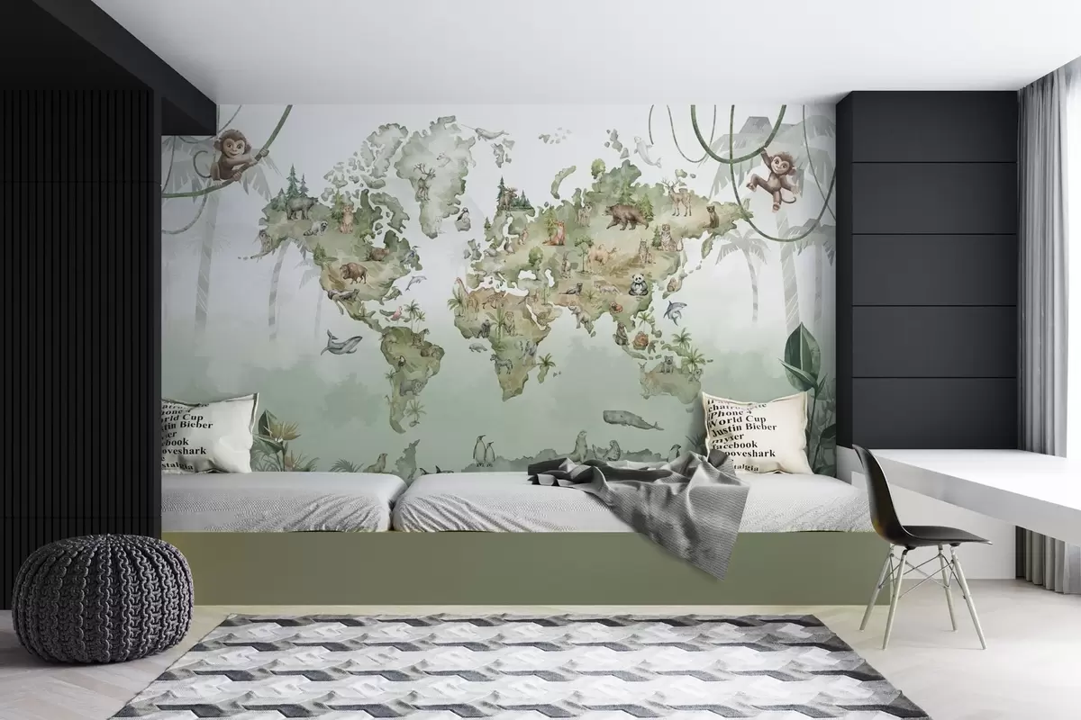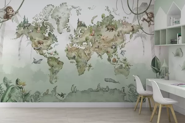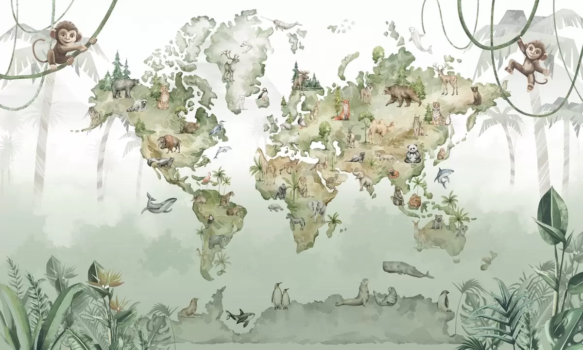 Papel de pared Mapamundi en acuarela con animales Nr. w04418